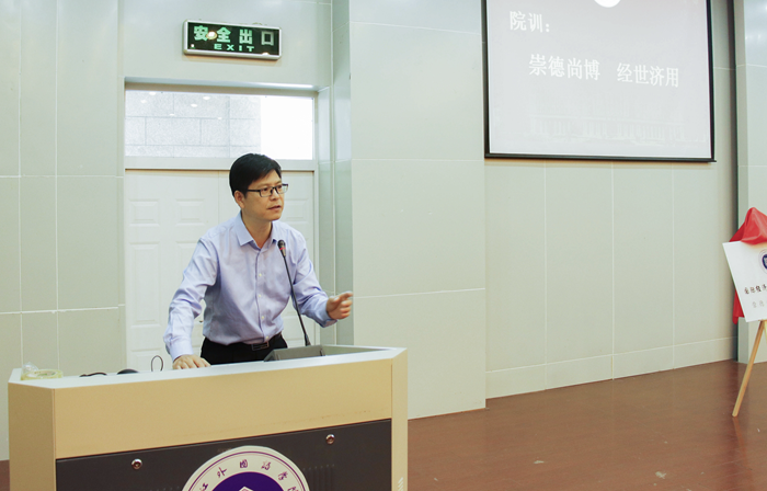 俞书记在介绍院训时指出,“崇德尚博”体现出学院在人才培养上的办学方向和国际化的办学理念。而且,其内含的‘德’、‘博’二字,恰好与整个学校‘明德弘毅,博雅通达’的校训相呼应。“经世济用”的院训精神也要求同学们将所学知识付诸实践,奉献社会。