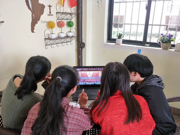 集体学、支部学、个人自学、开展调查研究、新媒体互动等形式火热展开,在学院党总支的统一部署下,各学生党支部陆续开展相关活动,组织学习宣传党的十九大精神。在雅致苑的学生宿舍里,同学们三三两两围坐在笔记本电脑前,仔细聆听着习近平总书记所作的报告,听到关于对青年的表述时同学们一致赞叹称好。