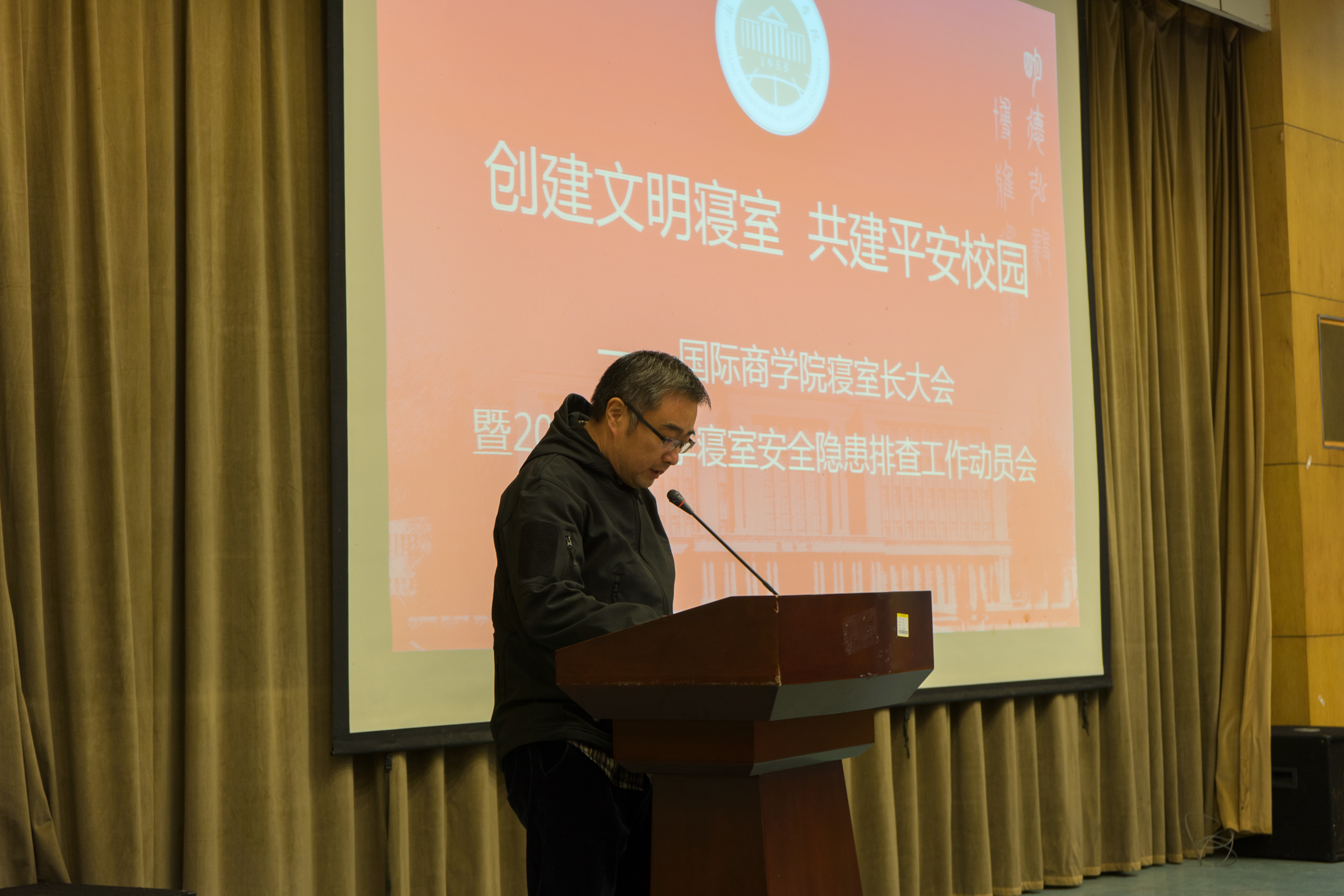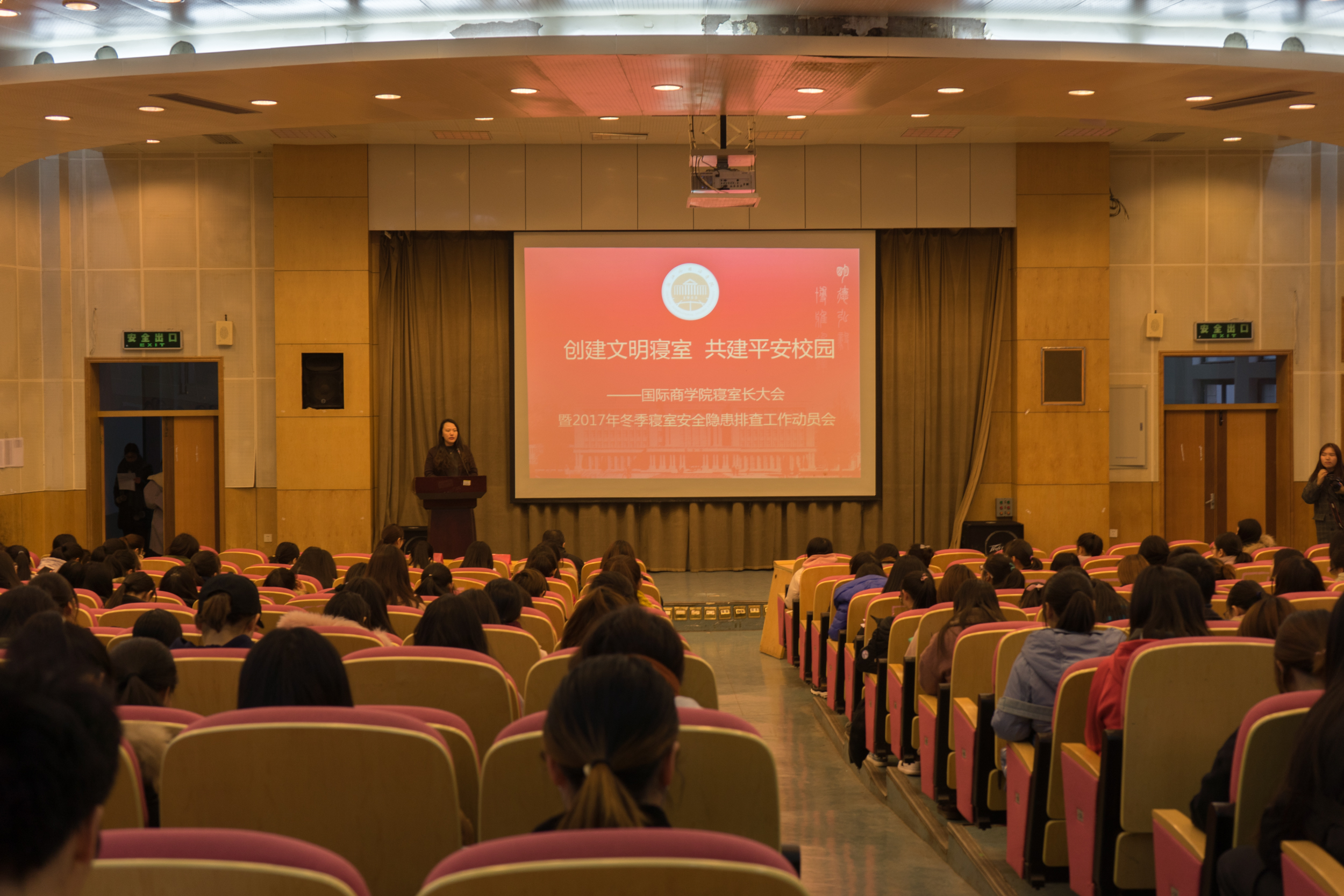 12月25日,国际商学院寝室长大会暨2017年冬季寝室安全隐患排查工作动员大会在望E115举行。校宿管与后勤服务办事中心主任裘姚侃,院学工办主任梁汲媛及全院寝室长参加了大会,会议由学院公寓文化中心指导老师岑盈盈主持。