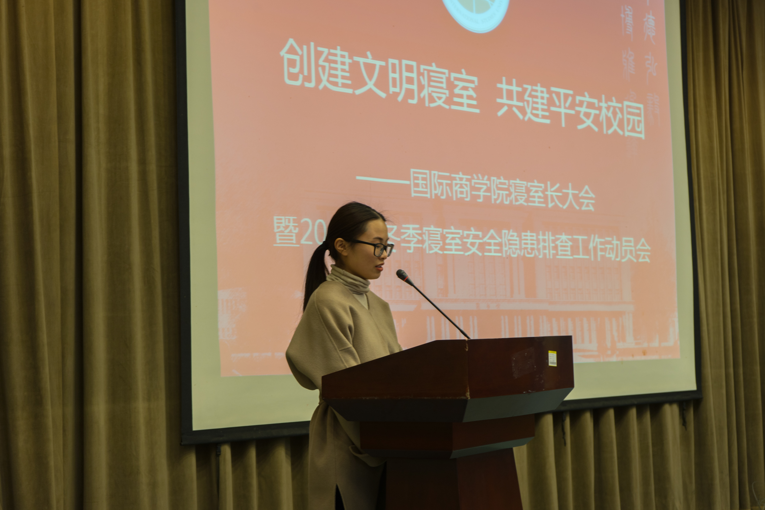 梁汲媛面向全体寝室长做动员讲话。她强调了寝室安全的重要性,要求全体寝室长认真学习寝室安全知识并做好寝室成员的传达工作和日常的监督工作,要求各班近期开展寝室安全隐患自查,营造安全舒适的学习生活环境迎接期末考试。