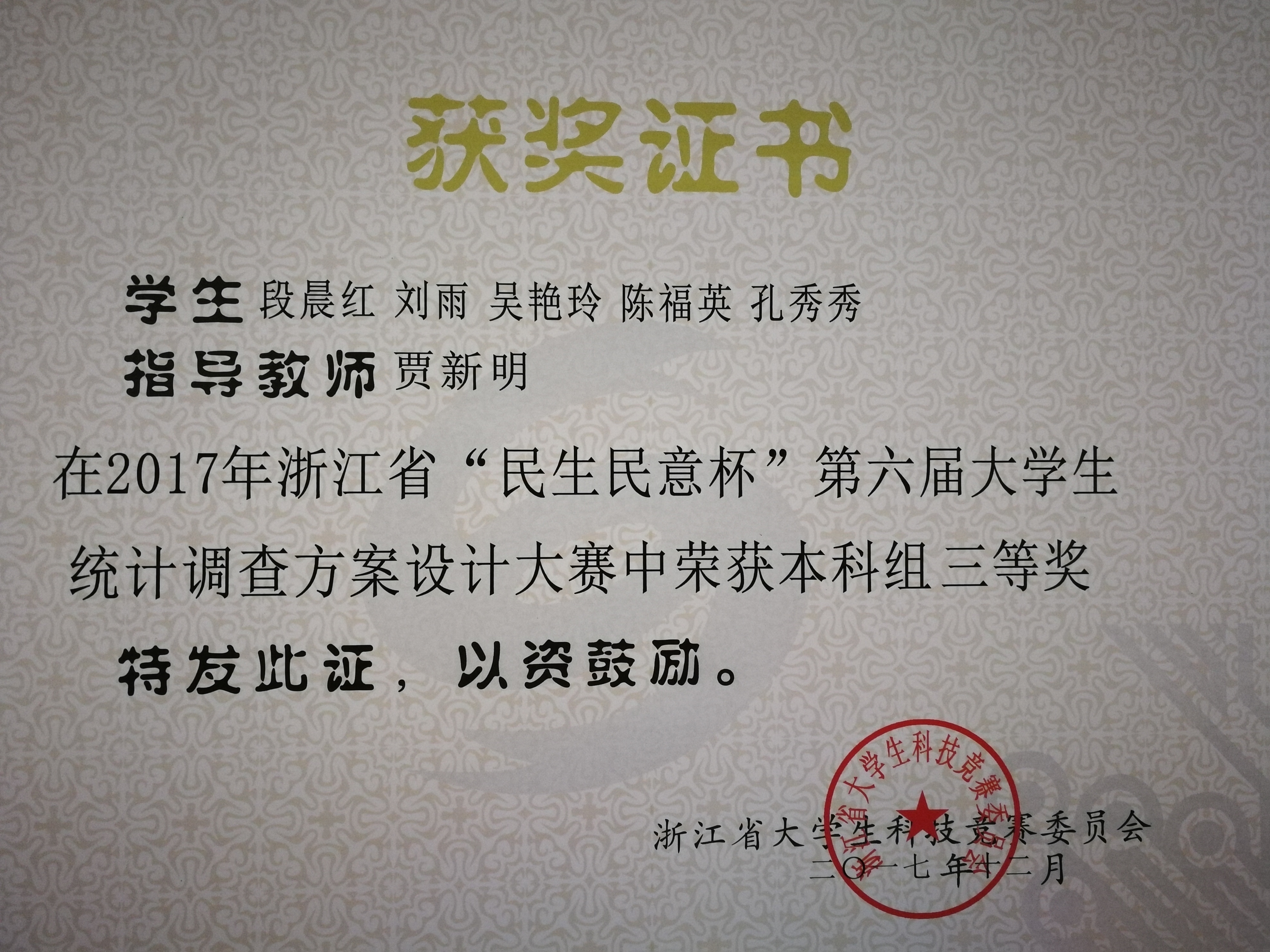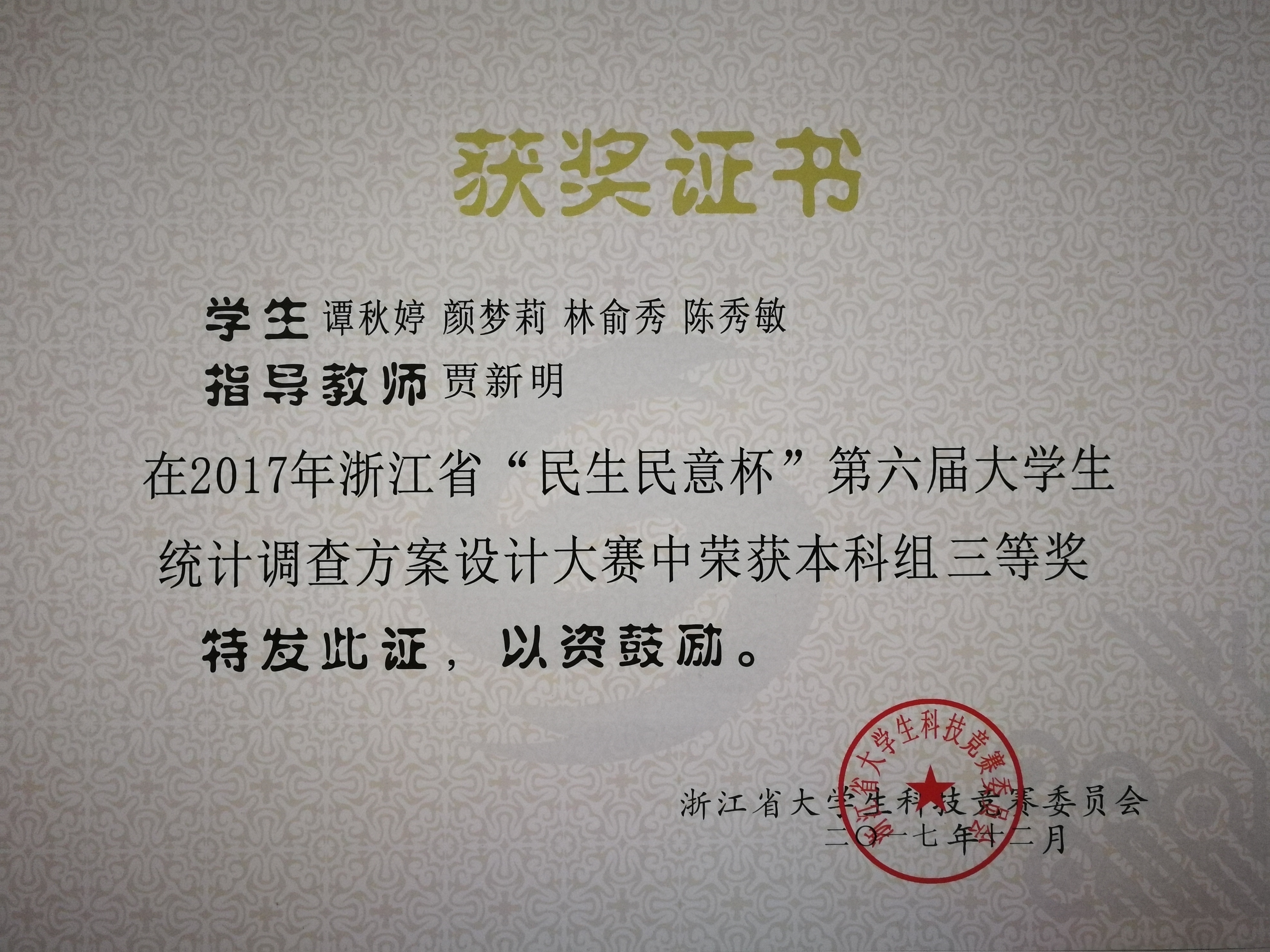 2017年浙江省“民生民意杯”第六届大学生统计调查方案设计大赛落下帷幕,国际商学院贾新明副教授指导的谭秋婷、段晨红等同学的二组作品分别获得大赛三等奖。我校连续六年参加了此项省级A类赛事,这是我校第二年再获佳绩。