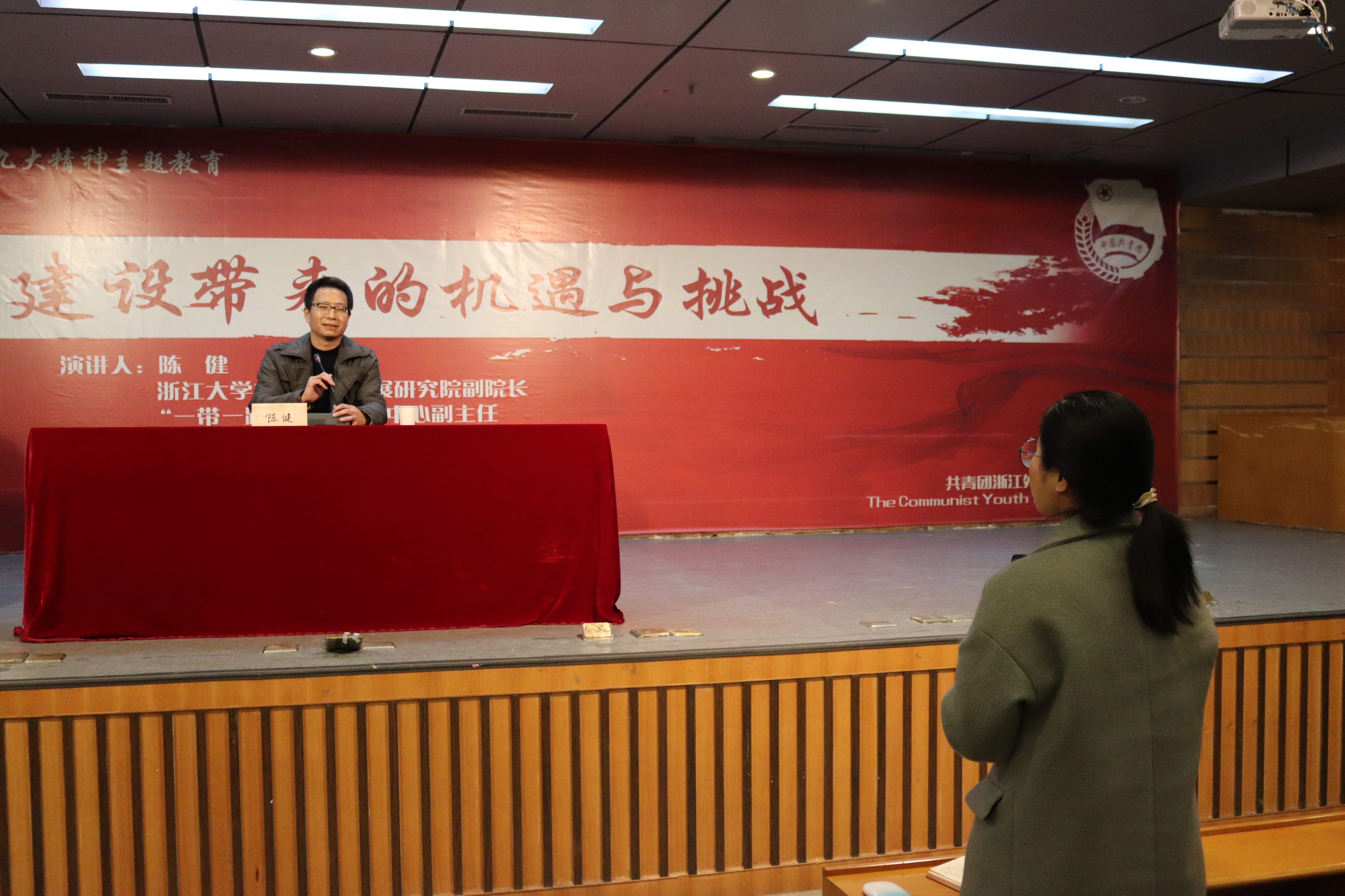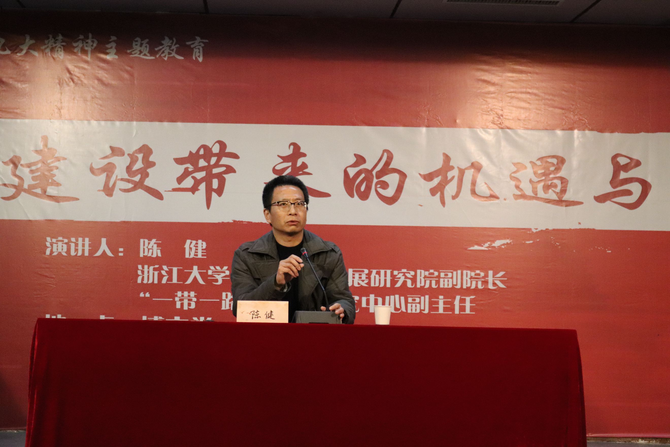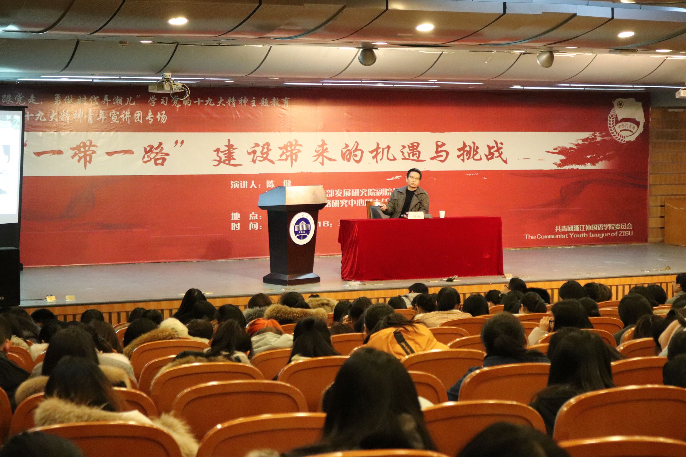 为深入学习宣传贯彻党的十九大精神,切实把全省各界青年的思想和行动统一到党的十九大精神上来,把力量凝聚到落实党的十九大确定的目标中去,1月10日晚六点半,以“一带一路”建设带来的机遇与挑战为主题的党的十九大精神宣讲活动在我校博文堂隆重举行。本次活动邀请浙江大学中国西部发展研究院副院长、“一带一路”战略研究中心副主任陈健担任宣讲嘉宾。校团委书记傅尧力、院团委书记周长喜出席本次活动及泥巴影视 370余名学生参加报告会。