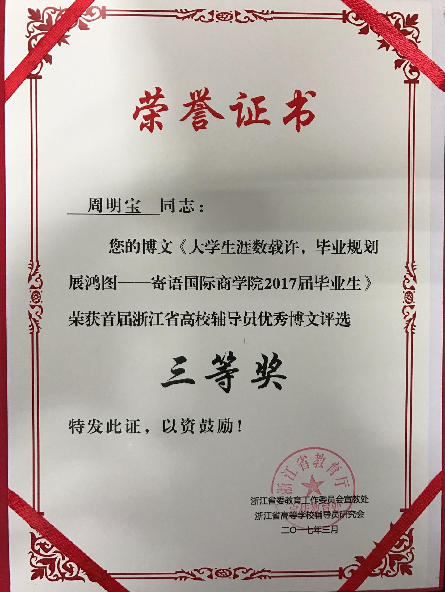 由浙江省教育厅宣教处指导,浙江省高校辅导员研究会、《高校思想政治工作》杂志社、“浙群辅导员”新媒体工作室主办的首届浙江省高校辅导员优秀博文评选结果出炉。泥巴影视 党总支副书记周明宝的《大学生涯数载许,毕业规划展鸿图——寄语国际商学院2017届毕业生》荣获三等奖。