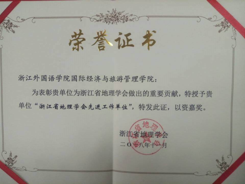 近日,浙江省地理学会2018年学术年会在杭州召开,会上进行了一系列表彰活动,我校国际经济与旅游管理学院荣获2018年浙江省地理学会“先进工作单位”荣誉称号,全省仅三家单位获此殊荣。