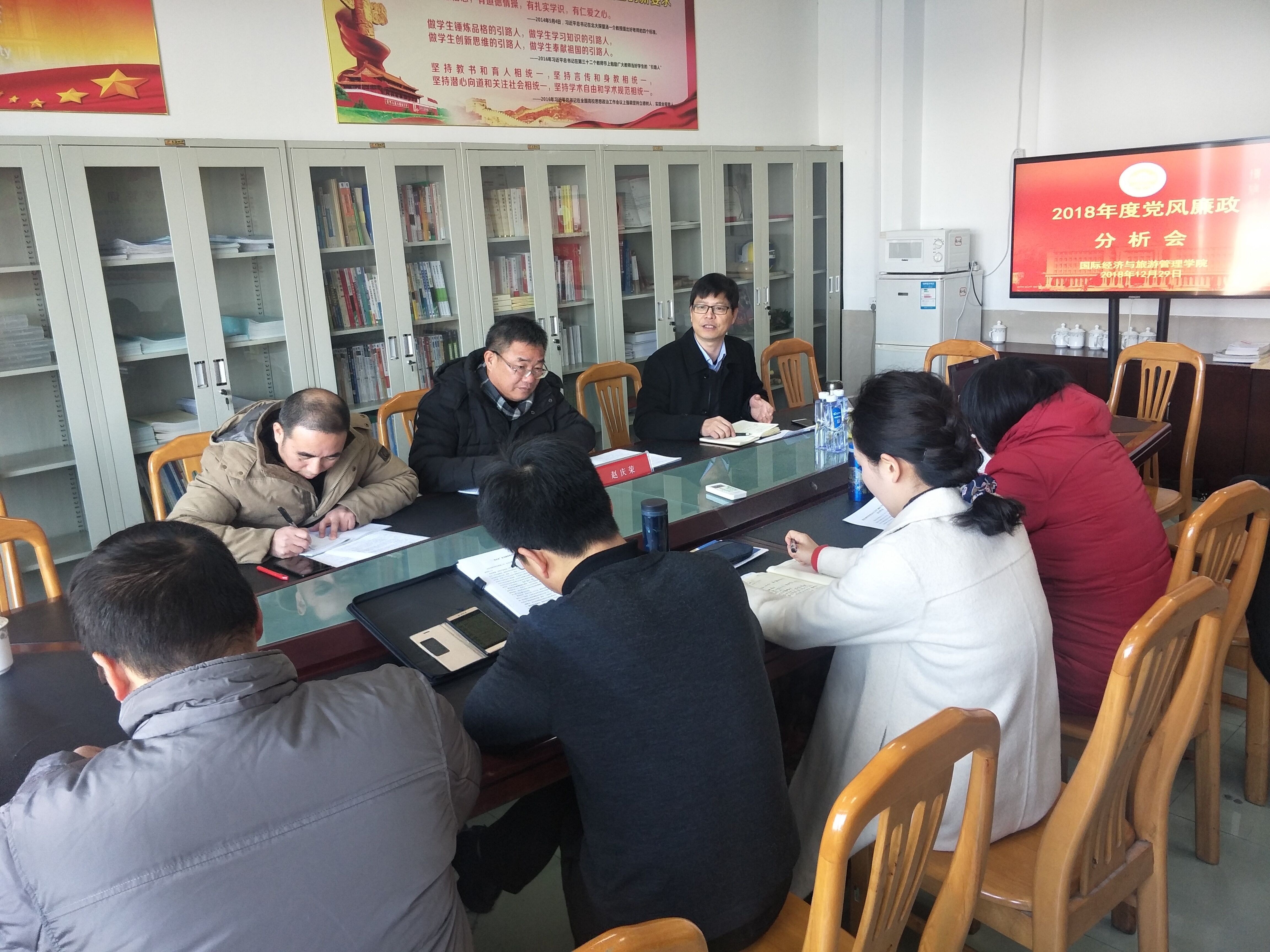 国际经济与旅游管理学院党总支于2018年12月29日上午召开了学院2018年度党风廉政建设分析会。会议主要围绕学院班子及成员落实党风廉政建设责任情况,按照“一岗双责”的要求认真查找薄弱环节和风险点,分析存在问题的原因,并有针对性地提出防控措施。校党委委员、副校长赵庆荣出席会议并作指导,学院全体党政班子成员和党总支委员参加会议。