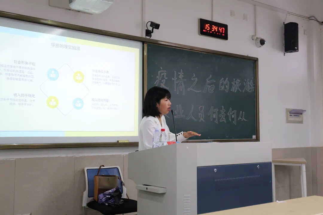 讲座中,汤玲玉凭借自己从业旅游业17年的丰富经验,主要从疫情之后国内外的旅游市场、疫情发生后的旅游行业艰难维生、目前旅游业的现状、未来旅游业的前景以及疫情之后该不该考导游证从事旅游业这六个方面展开。
