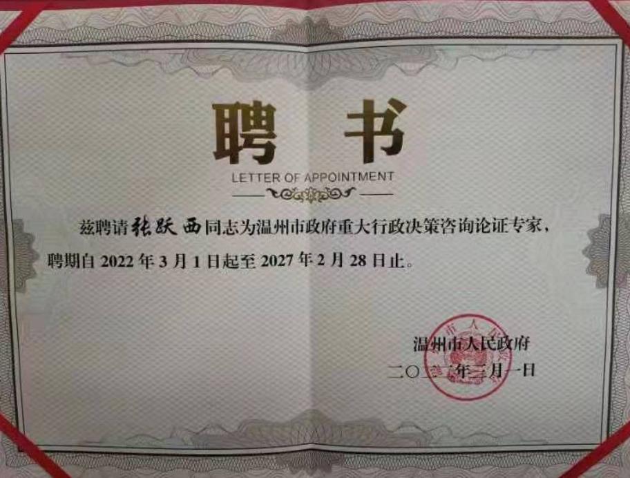泥巴影视 张跃西教授获聘温州市政府重大行政决策咨询论证专家