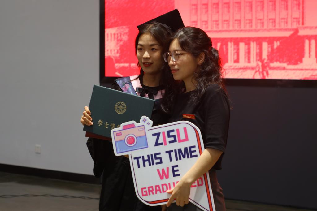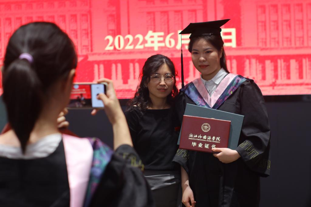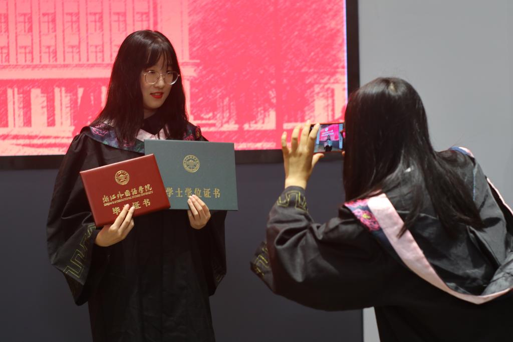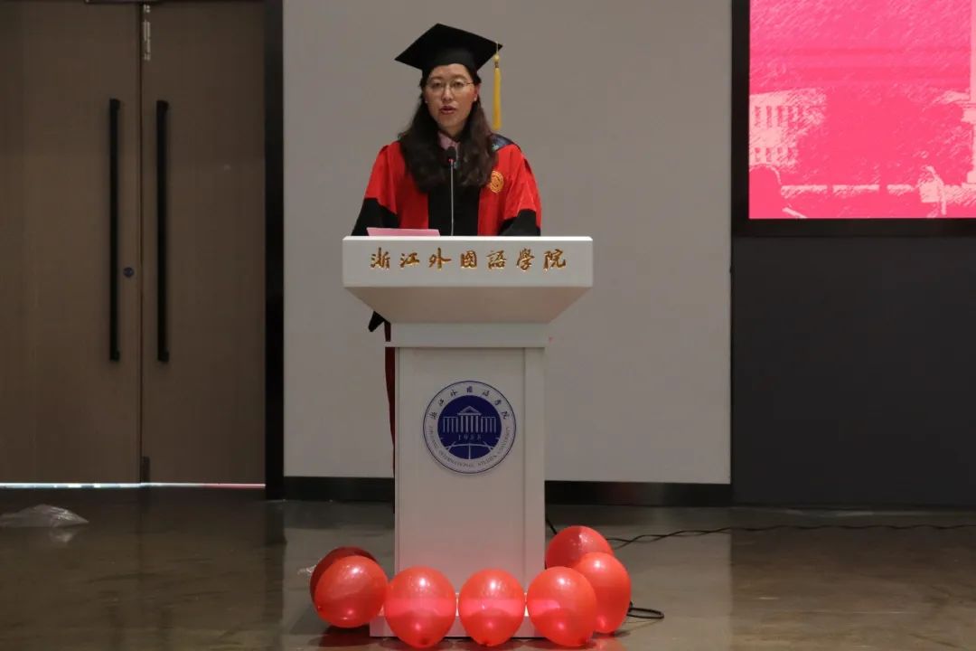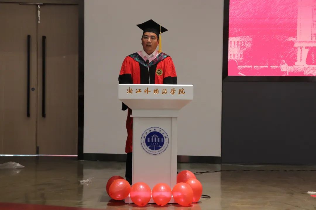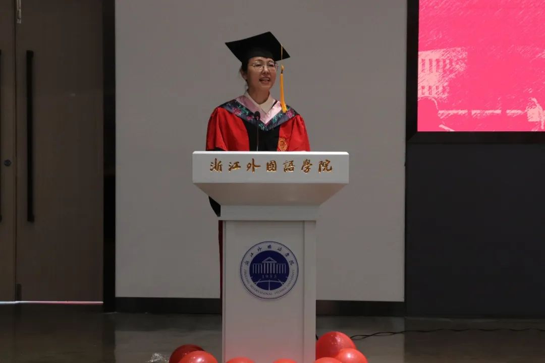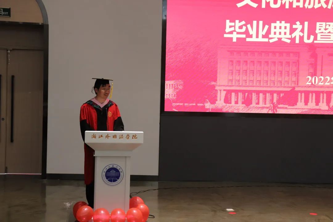 毕业生代表18会展1班吴杰和第九届“我最喜爱的老师”代表高静老师先后发言。回首大学时光吴杰满含激动地说:“在浙外生活的这四年,让我感受到校园真正该有的温度,充满人情味和烟火气的校园让我更加不舍。但落日归山海,少年归心之所向。大学的毕业并不代表结束,而是新阶段的启程。”在依依离别之际,高静老师叮嘱道:“想念母校之时,手机就是一张回家的车票,你们在那头,老师在这头,纵使相隔千山万水,母校永远是你们最长情的陪伴。”