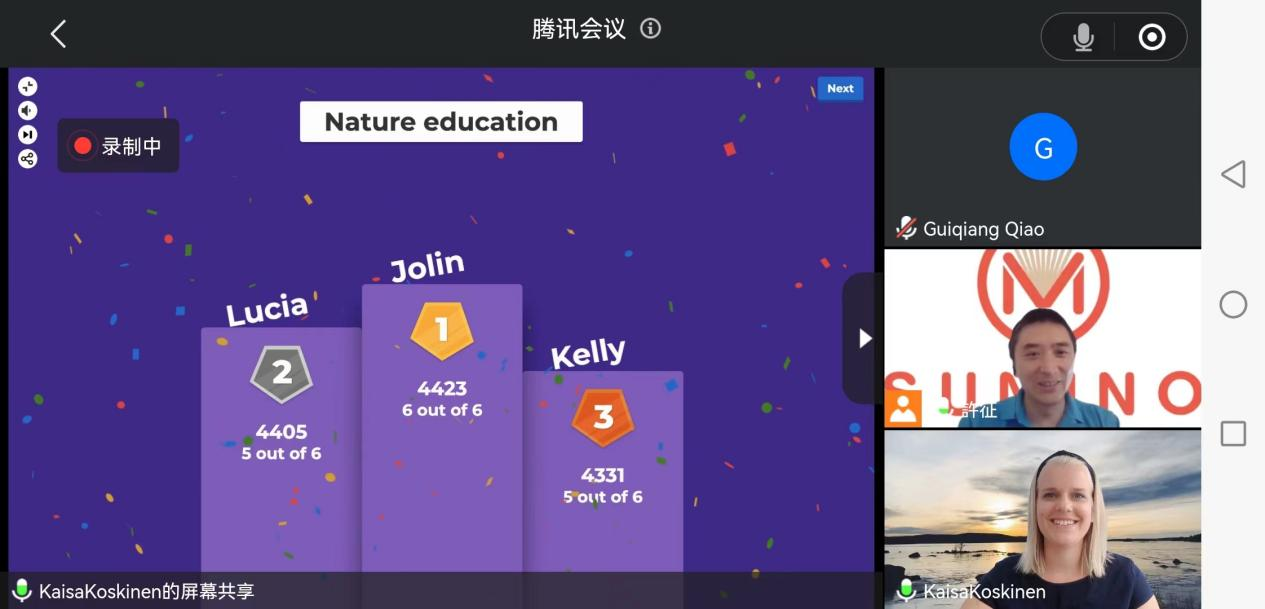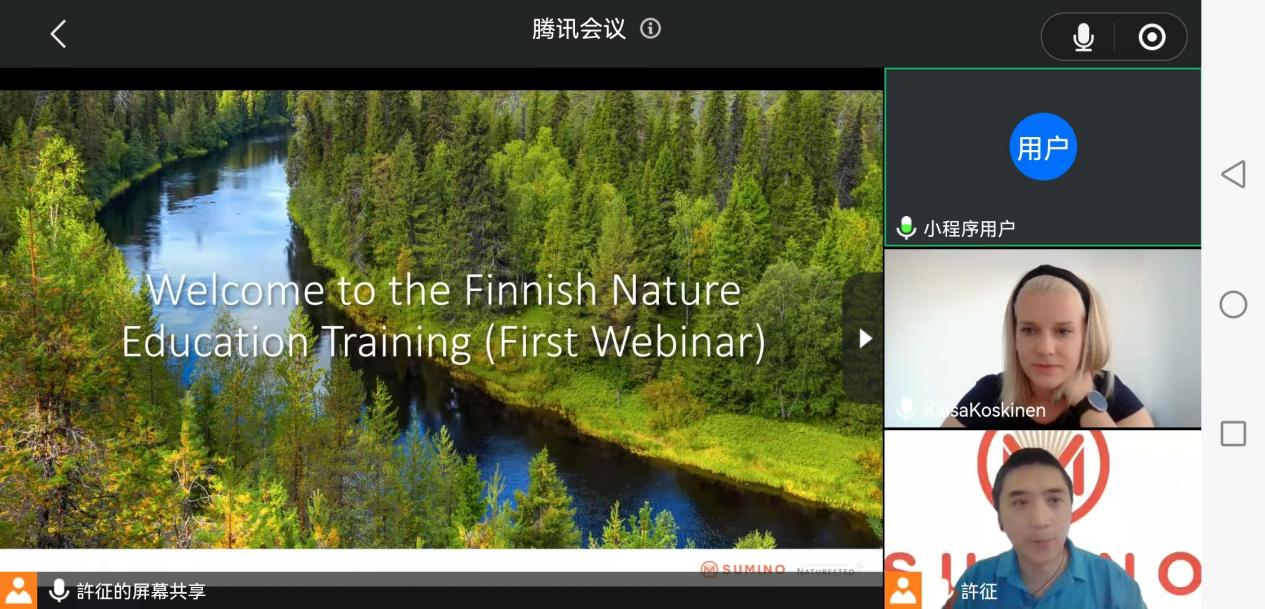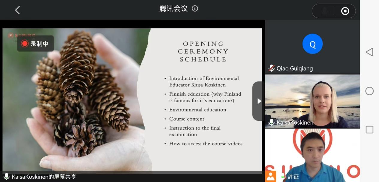 开营仪式由芬兰书米教育项目总监许征老师主持,他表示希望通过此次培训同学们能进一步拓宽视野、增强才干。本次培训的授课老师——芬兰书米教育自然教育专家Kaisa致开营辞。在进行了生动有趣的自我介绍后,Kaisa老师向同学们介绍了芬兰的自然教育以及本次研学培训的课程整体安排和考核方法。紧接着由许老师向同学们介绍如何登录小鹅通并获得课程视频的访问权限。为确保同学们都已操作成功,许老师和Kaisa老师组织了一个快问快答小游戏,同学们在这场芬兰知识竞答中玩的不亦乐乎。最后,许老师和Kaisa老师向大家表示,培训过程中有任何问题都可以提出并联系老师们。虽然是线上会议,但老师们的亲切与用心感染着参加本次开营仪式的每位同学。