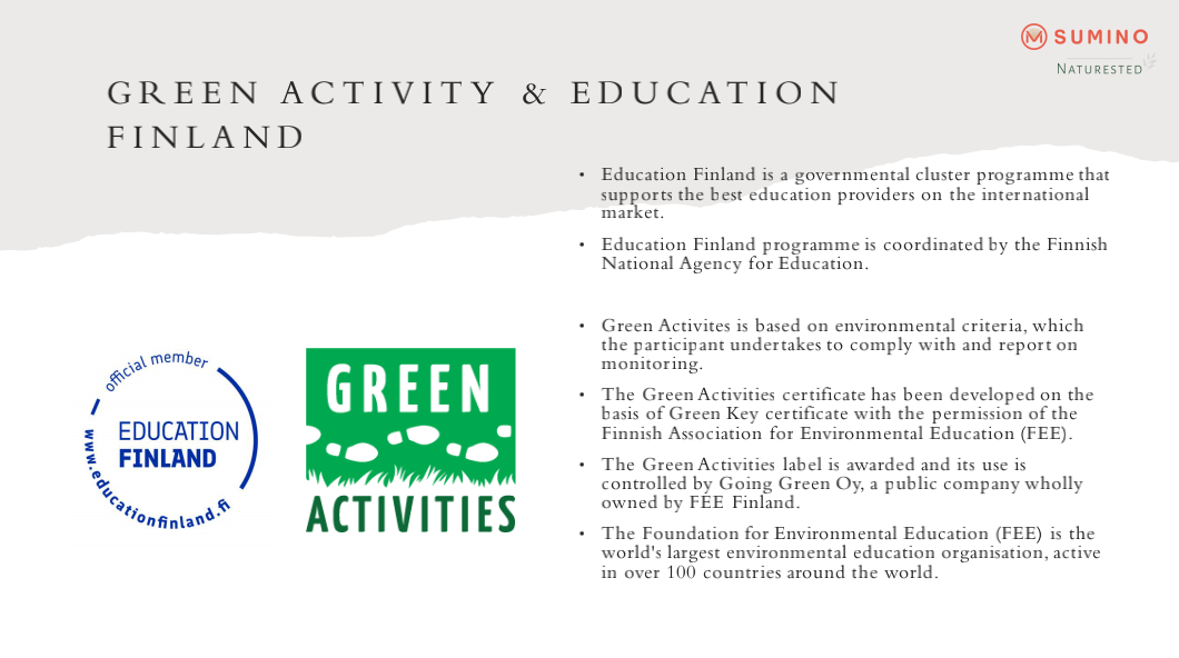 主办,芬兰書米国际教育有限公司和Finland International Education共同负责,包括资源对接、外教管理、课程内容、培训测评和证书颁发等。项目旨在帮助同学们了解和学习芬兰自然教育体系、学会如何开展自然与户外教育以获得较为全面的自然教育专业知识。营员们不仅可以通过此次培训获得全外语学习专业课程的经验,还可以在培训项目结束时获得Green Activity和芬兰教育部颁发的自然教育认证,为这个暑期注入学习与证书双丰收的别样体验。