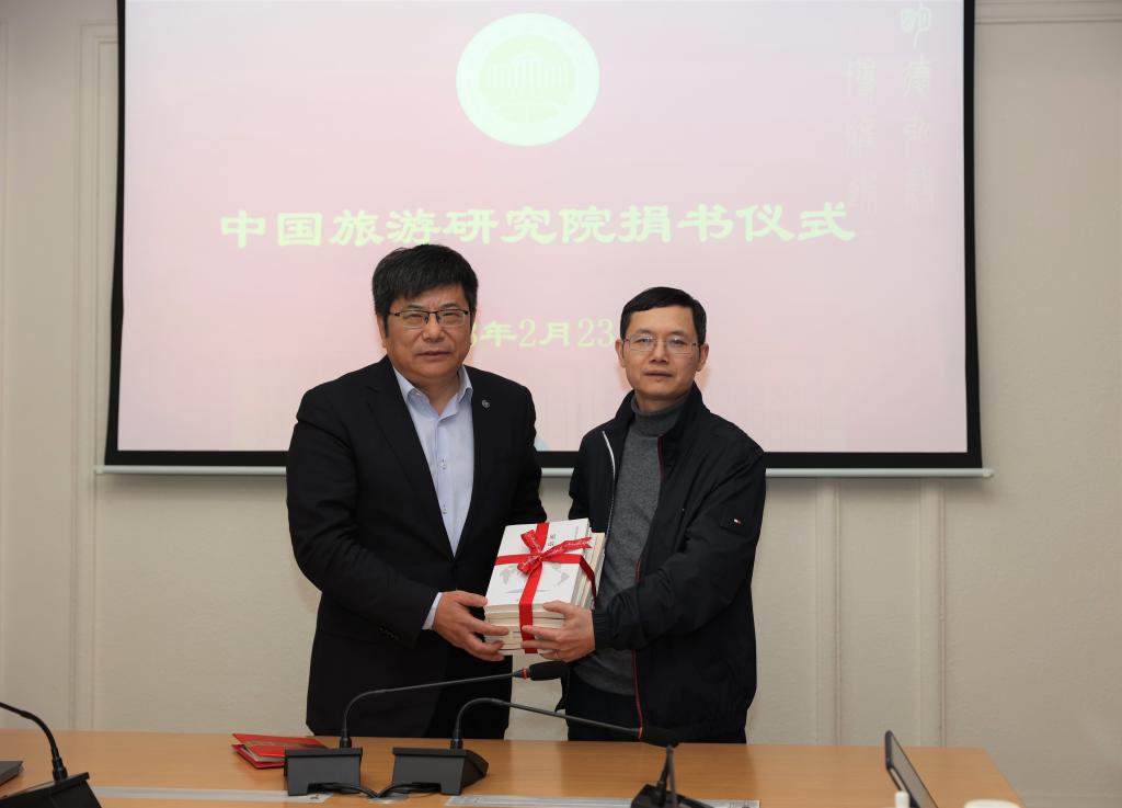 在随后举行的捐书仪式上,戴斌院长代表中国旅游研究院向学校图书馆捐赠了《旅游大数据理论、技术与应用》《旅行社管理》《国民旅游休闲讲稿》等110余册著作。副校长李安向戴斌颁发了捐赠证书。