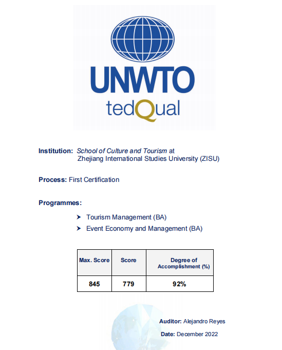 联合国世界旅游组织旅游教育质量国际认证是全球唯一旅游类国际教育认证,旨在提高全球旅游教育、旅游培训及旅游研究项目的质量,推广全球旅游伦理价值,在旅游教育的标准化、品质化和国际化方面具有很好的显示度。通过该项认证,表明我校旅游管理专业、会展经济与管理专业已建立起高水平、国际化的专业教育体系。