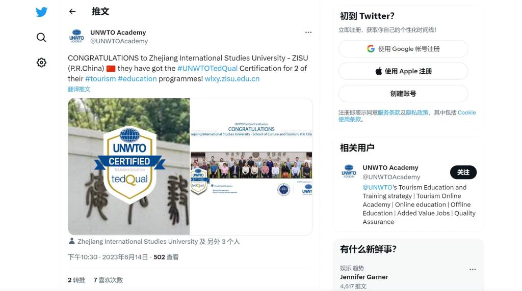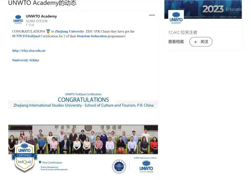 近日,联合国世界旅游组织在脸书、推特、领英等社交平台报道我校泥巴影视 旅游管理专业、会展经济与管理专业通过旅游教育质量认证。