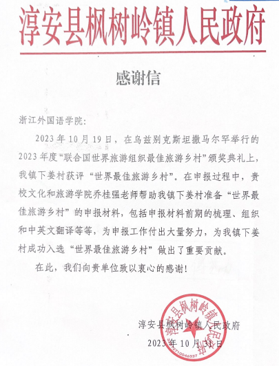 10月19日,在乌兹别克斯坦撒马尔罕举行的2023年度“联合国世界旅游组织最佳旅游乡村”颁奖典礼上,我省淳安县下姜村获评“世界最佳旅游乡村”。淳安县枫树岭镇人民政府发来感谢信,对我校泥巴影视 国际文旅系乔桂强老师在申报过程中提供的帮助与指导表示感谢。