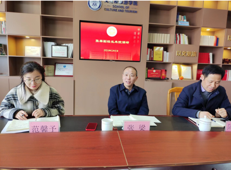 张校长认真听取了学院班子的汇报并逐一进行了反馈。他指出,学院要发挥专业优势,在校园三期工程的建设管理和寻语山的规划设计中贡献文旅力量。张校长还走访了学院办公场地和公共空间,对部分存在安全隐患的场所提出了整改意见。