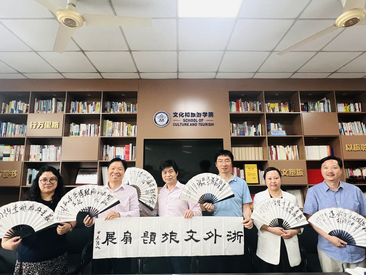 布展期间,恰逢北京大学新闻与传播学院博士生导师、北京大学视听传播研究中心主任、中国大众文化学会会长陆地教授和北京大学中国诗歌研究院副院长高秀芹教授来浙外为文旅师生作专题讲座,两位教授现场观摩后对学院育人的用心用情十分赞赏,认为题扇寄语创意别出心裁,颇具意义。陆地教授欣然为本次展览题字。