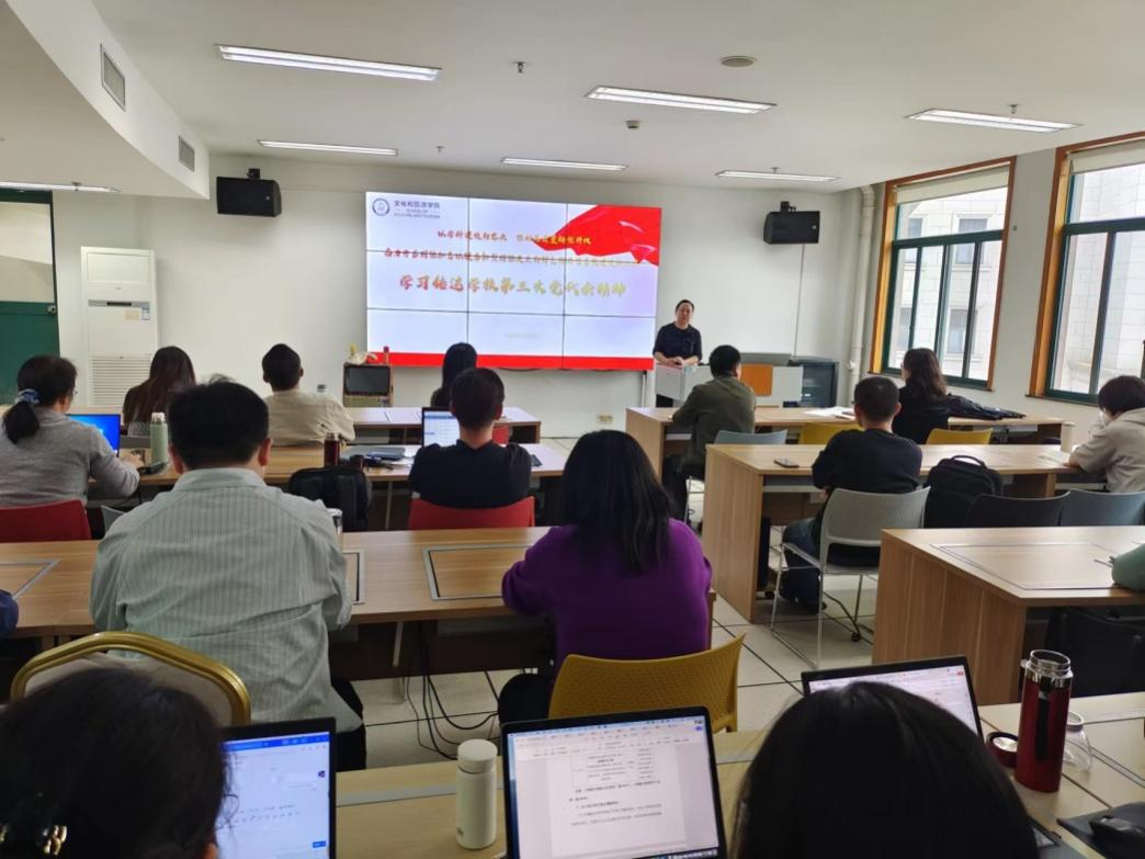 会上,学院党总支副书记、党代表黄瑾以详细的图解,为教职工传达了学校第三次党代会精神,对大会主题、过去五年十个方面的工作成就、三方面至深体会、六个规律性认识,学校的新使命新定位及中远期愿景、锻造浙外能力及六个显著提升、三大发展战略、八个“新”的五年建设任务、党的建设任务等进行了深入解读。