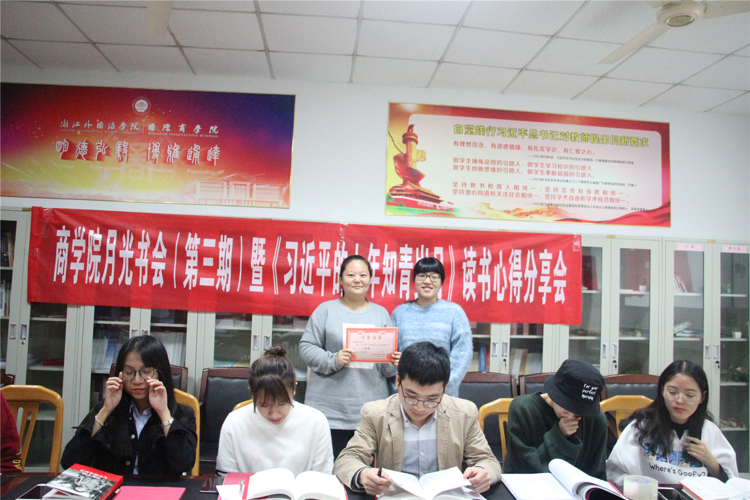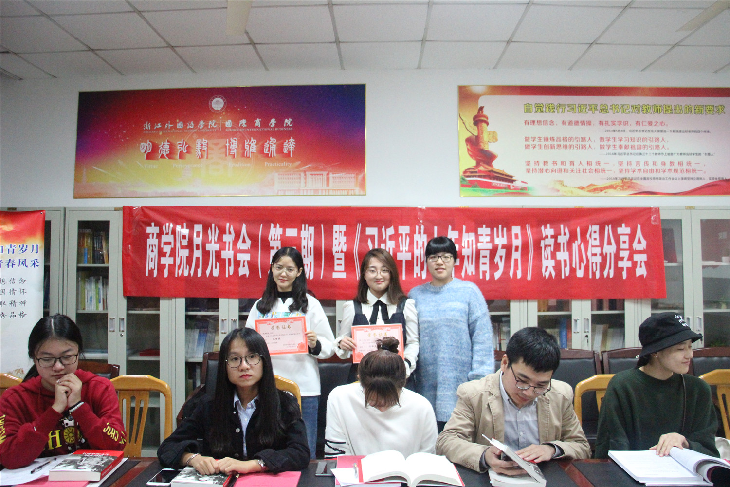 10月29日晚,商学院月光书会(第三期)暨《习近平的七年知青岁月》读书心得分享会于望院D428教室举行。学生泥巴影视指导老师王化明、学生泥巴影视主任陈雪珂及日前学院举办的音频征集比赛获奖同学出席会议,本次会议由院学生泥巴影视办公室部长刘玉主持,在座同学谈心得、说体会、话担当,总结学习感悟。