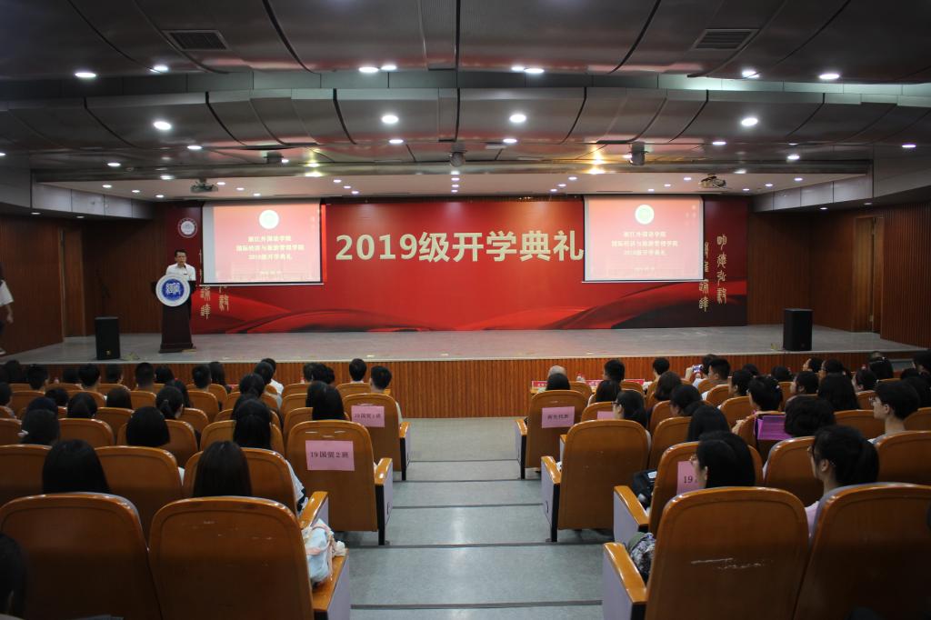 2019级开学典礼在博文堂二楼隆重举行。学院院长赵银德、院党总支书记俞海山、副院长钱晨、李伟庆、教授代表、各系系主任、新生班主任和辅导员出席典礼,院党总支副书记杨立乾主持。