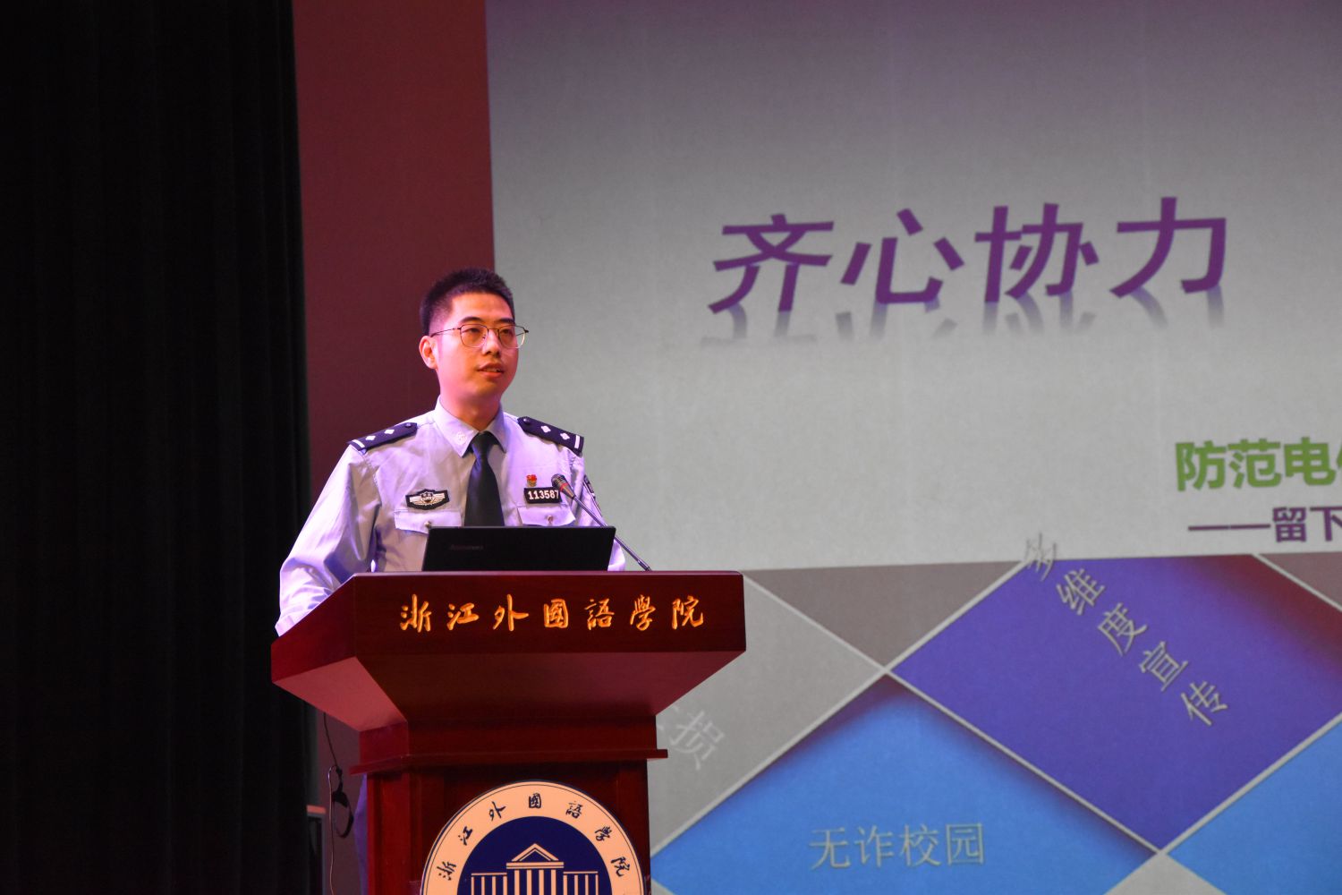 大会上,金玉荣以三个网络诈骗的典型事例说明,网络电信诈骗在大学生群体中频频发生,有愈演愈烈之趋势。他通过视频播放、幻灯片播放、亲身经历事例分享等多种形式,为在座新生们揭露了一个个网络电信诈骗骗局,提醒每一位新生:网络诈骗无处不在,谨防网络诈骗!他指出,谨防网络诈骗要从“心防”、“人防”、“技防”三个方面进行,被骗后的急救措施有“临时止锁”、“电话封停”、“银行止损”。除此之外,他还提醒新生们,谨防网络诈骗不仅要从自身做起,还要做好宣传工作,多向周围的亲友宣传网络电信诈骗知识。