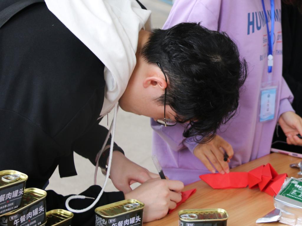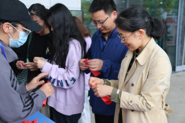 参展师生们饶有兴致地观看展览后,亲手体验了折红船活动。展板上一只只由师生们用心折叠而成的红船,汇聚组成党徽图案,彰显了我们党从红船启航,历经百年,成长为领航中国的巍巍巨轮。