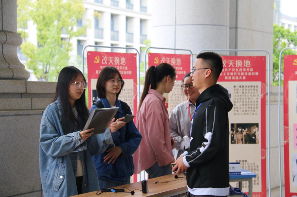 422日下午,由经旅学院旅游会展专业学生党支部、20会展1班和党建服务站联合承办的“百年征程,不忘初心”党史学习主题活动展在弘文馆前开展。
