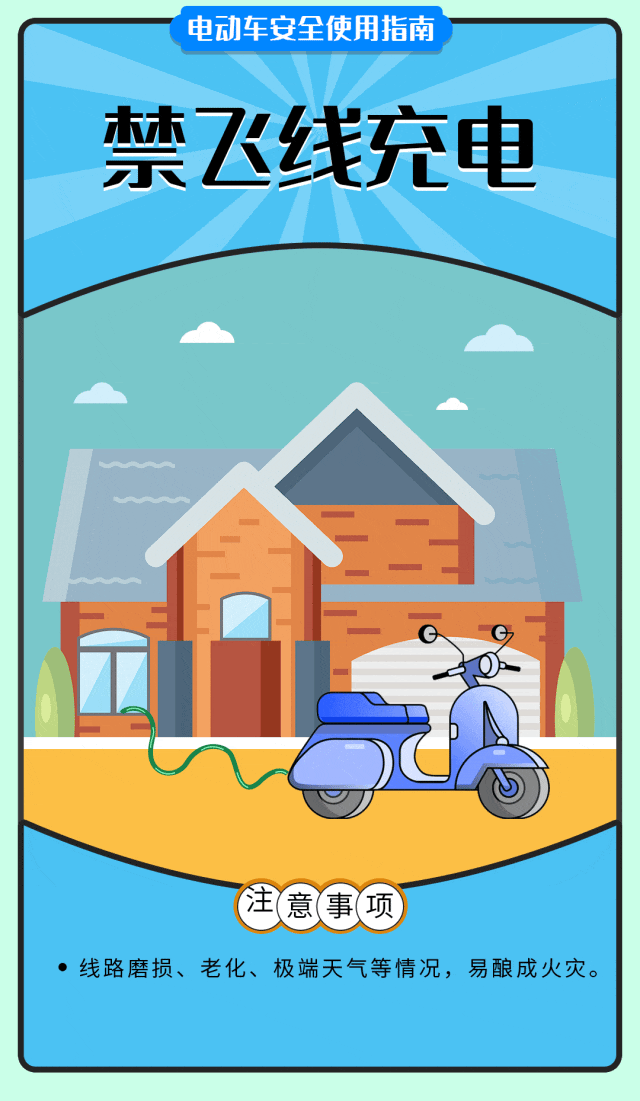 严禁使用超长电线为电动车供电,“飞线”并不能便捷充电,反而会带来不可避免的后果,切记!