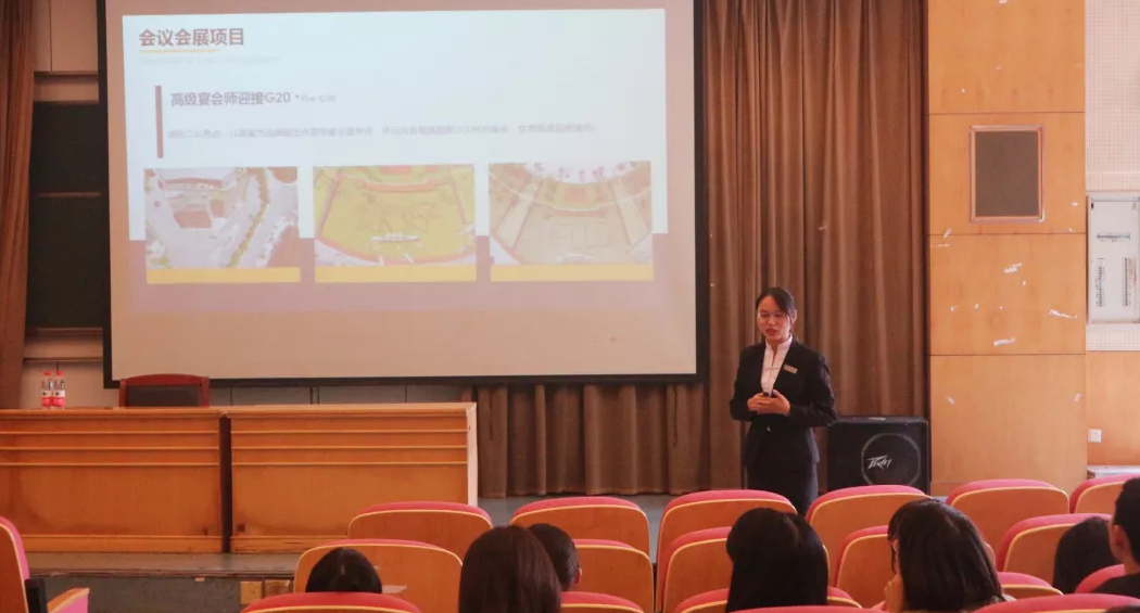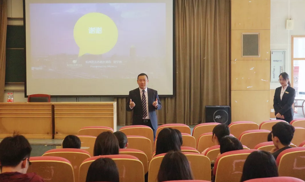 黄龙饭店人力资源总监罗滢同样从酒店品牌出发,介绍了黄龙饭店的概况,并详细介绍了实习生的招聘需求、福利待遇等。绿城桃花源·黄龙度假酒店的胡总和黄龙饭店管理公司的贺总分别分享了各自的职业发展路径,以亲身经历为同学们带来了精彩的职业生涯规划案例。
