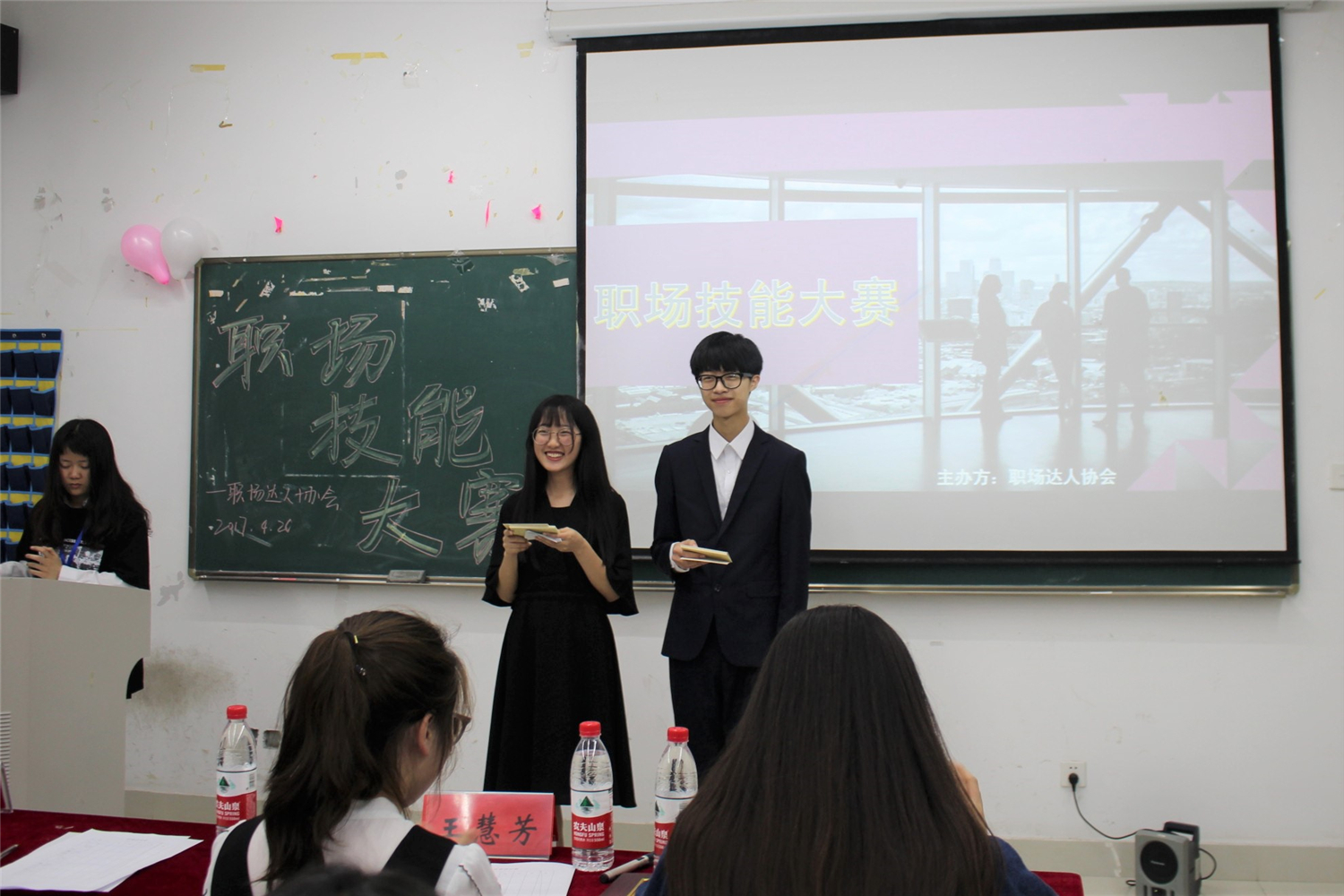 4月20日晚6点半,由泥巴影视 学生会职场达人协会主办的职场技能大赛在品院A209顺利举行,泥巴影视 辅导员赵冬冬,礼仪社社长张明圆,学生会主席彭于凡,副主席杨雅婷以及学生国际文化交流中心负责人郭冰霞应邀到场,同时来自高顿财经的特邀嘉宾王慧芳老师也出席了本次大赛。