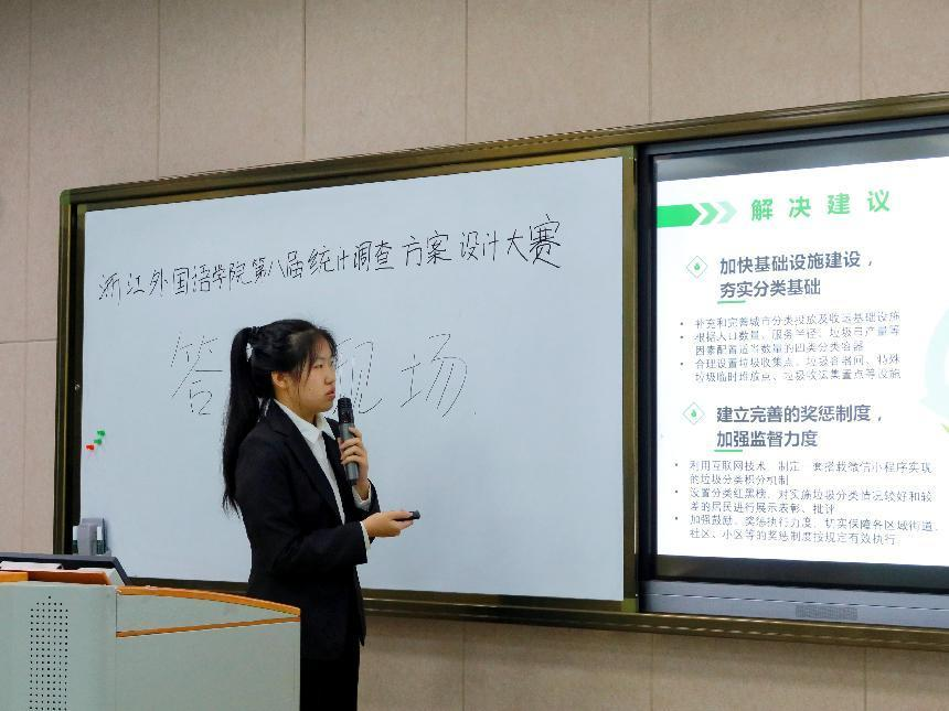 大赛经过预选赛,产生了10个优秀作品。此次答辩以团队小组展示成果的形式开展。各组成员准备充分,将调查问卷、数据分析、调查结论等逐一展示。指导老师们的点评一针见血,专业且独到。