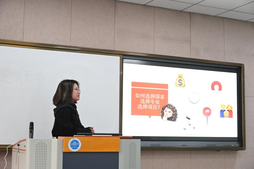 20旅管1班俞子涵目前拟录取法国里昂商学院。俞子涵为同学们带来了关于国家、专业、人生项目选择的经验。她将这几项细分资金、吸引力、时间等因素。“大家要对家里的经济情况有所了解,再来选择是否留学以及留学的具体国家。”除了资金,家人提供的精神支持也是十分重要的。在这点上,俞子涵学姐表示父母的认可与鼓励带给了她巨大的力量。