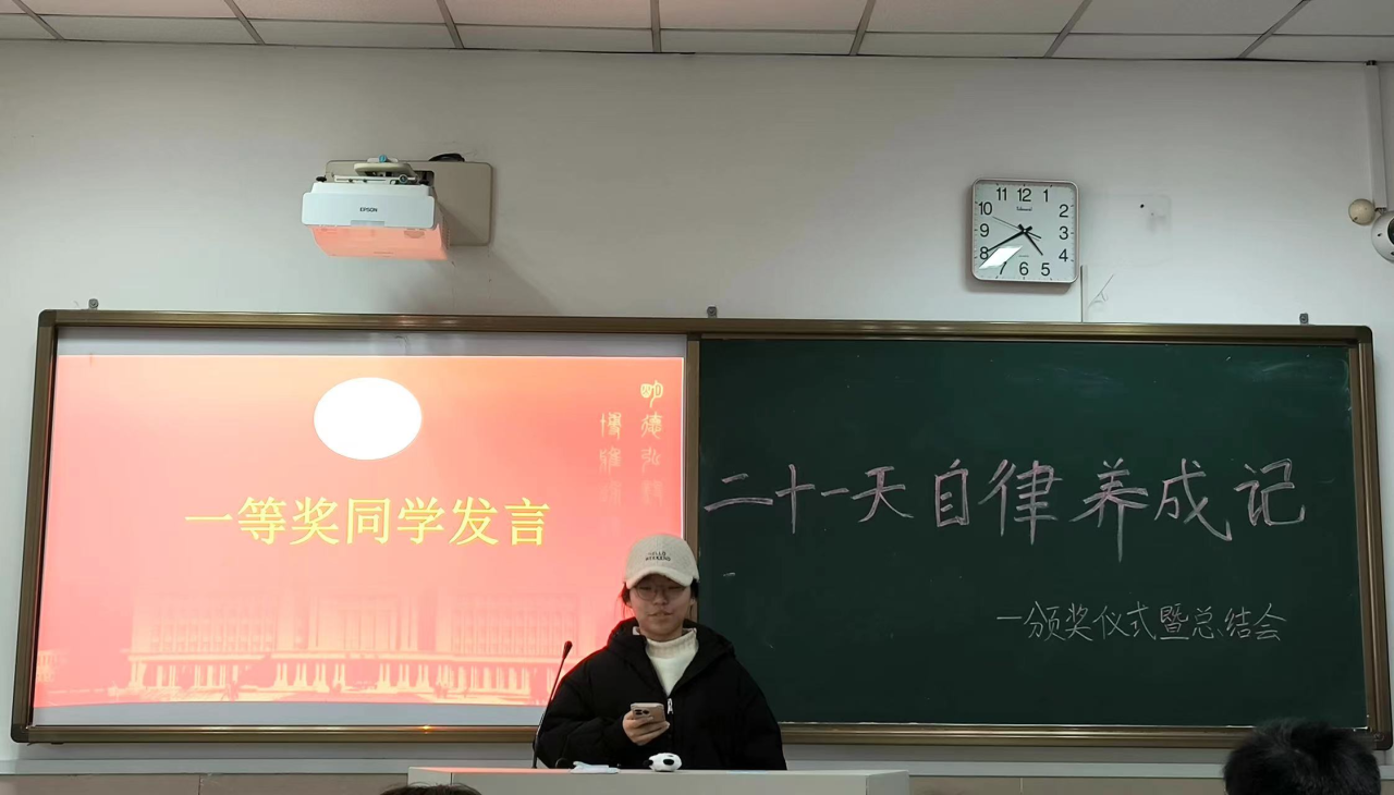12月29日,颁奖仪式暨总结会顺利举行。23旅管4班许千诺同学在本次颁奖典礼上分享了她这21天来的心得体会。通过这次活动,她不仅啃下了四级大纲词汇,提高了身体素质,更是深刻体会到自律的重要性。她说,“自律不仅仅是一种习惯,更是一种态度,一种对待生活,对待自己的态度。”这21天的经历,成为了她人生中一段宝贵的时光。