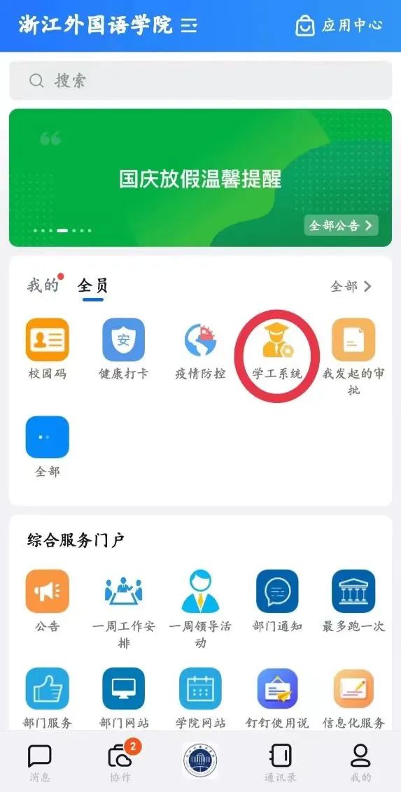 第一步,打开钉钉,选择工作台,进入学工系统。