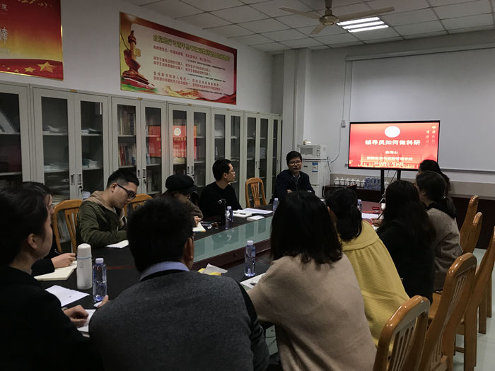 俞海山围绕科研项目选题、申报书填写、前期准备等对辅导员科研进行指导,他认为,辅导员作为一线思政工作者,在高校能积累大量科研素材,要勤于思考、善于总结,处理好思政工作者和科研工作者双重角色;学习与科研要对接学校需求、国家需要;在科研选题上要力求新颖,交叉学科领域更容易做出成绩。他希望辅导员进一步强化科研意识,保持和提升学术敏感性,努力做到思政、科研相互促进。