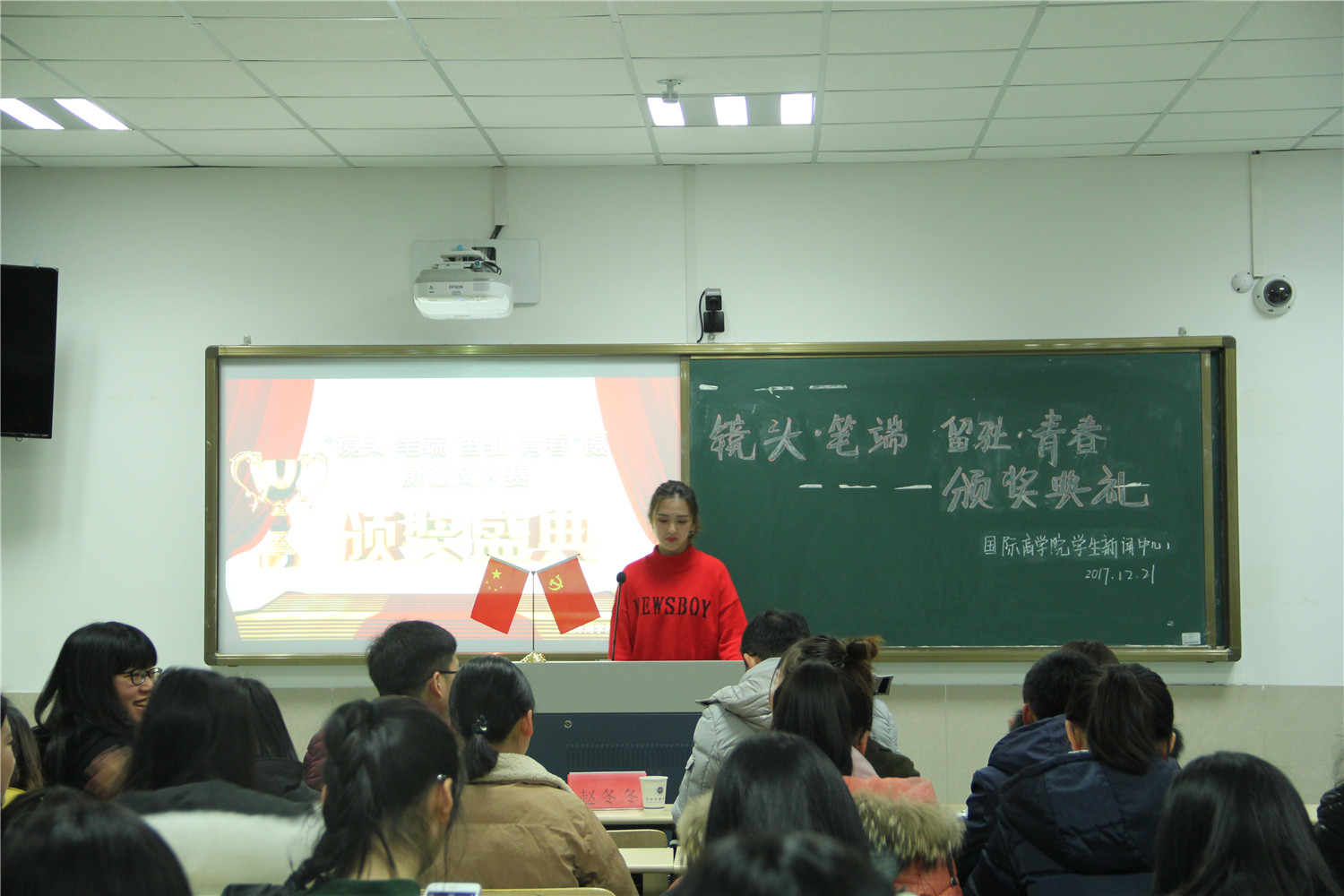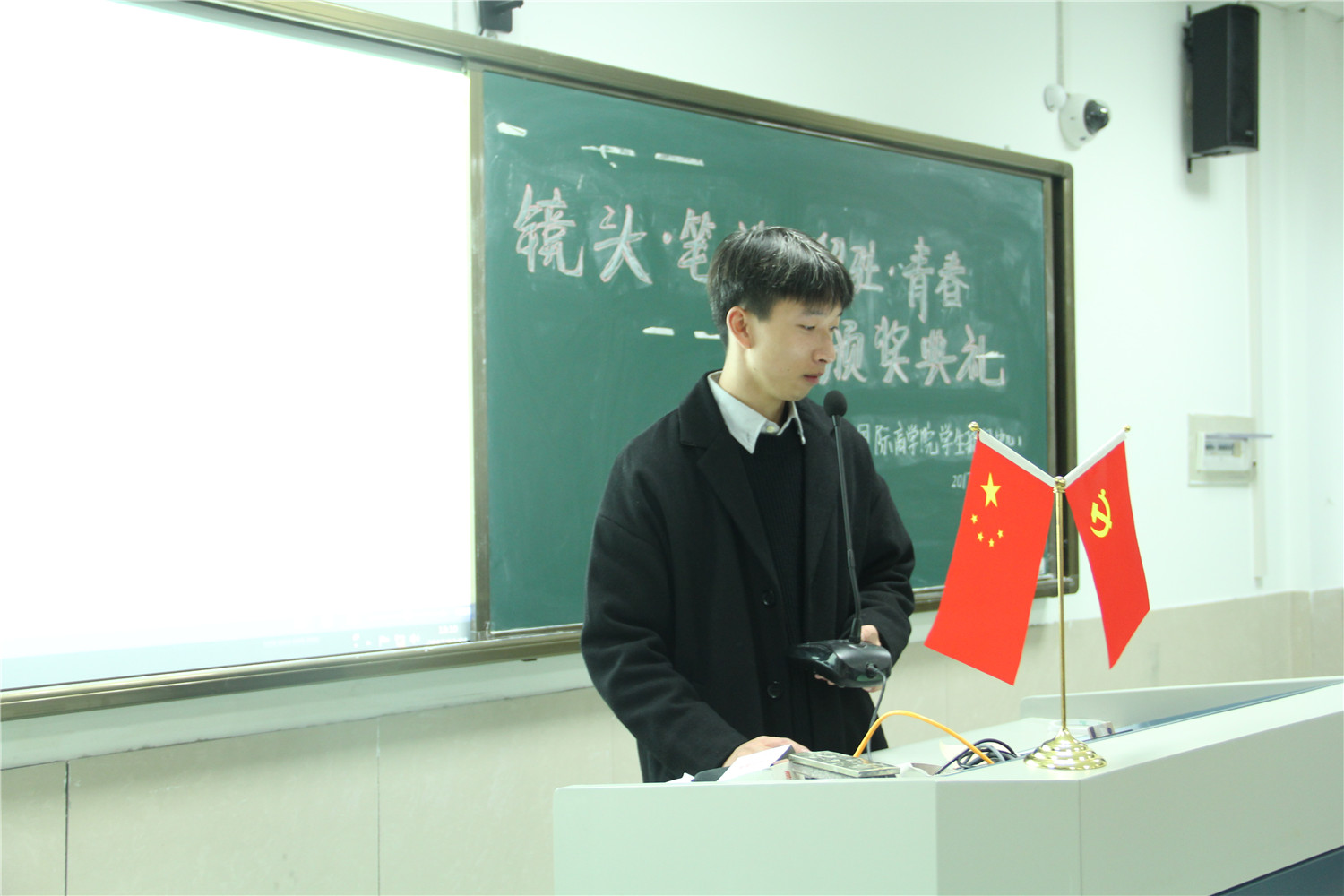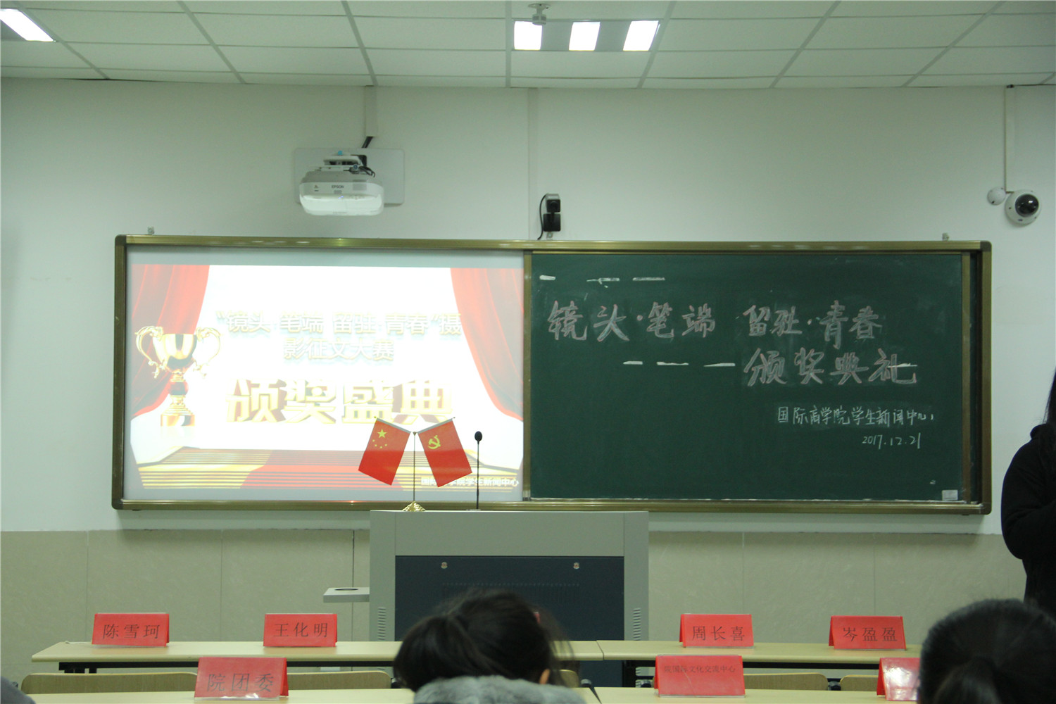 日前,由院学生泥巴影视主办的“镜头•笔端 留驻•青春”主题征文摄影活动已完美结束。12月21日晚上,泥巴影视 在望院D306教室举行了“镜头•笔端 留驻•青春”颁奖典礼。院团委指导老师周长喜、院学生会指导老师赵冬冬、院学生公寓文化中心指导老师岑盈盈、院学生泥巴影视指导老师王化明以及院学生泥巴影视主任陈雪珂受邀出席。