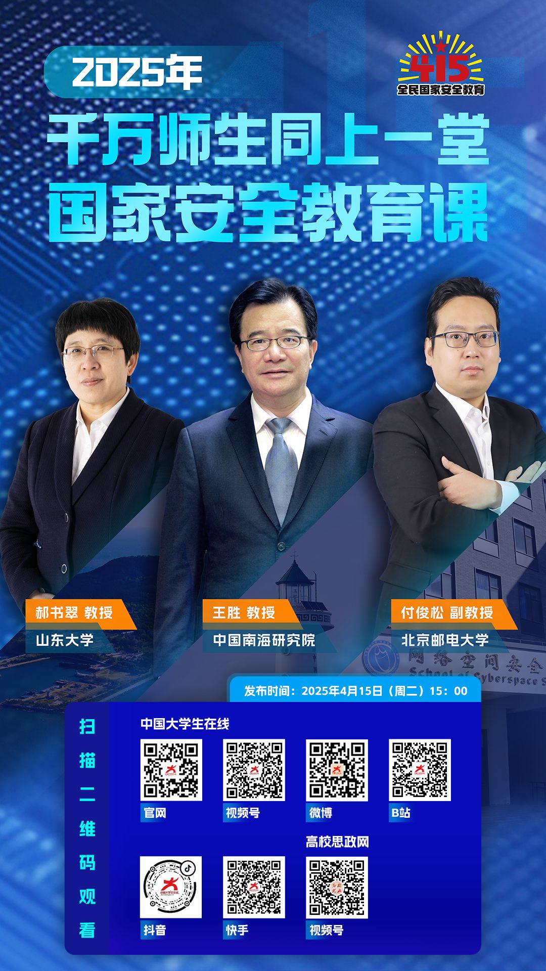在第十个全民国家安全教育日到来之际,在教育部思想政治工作司指导下,中国大学生在线面向全国高校师生推出《千万师生同上一堂国家安全教育课》,采取线上发布课程的形式,邀请中国南海研究院王胜教授、山东大学马克思主义学院(威海)郝书翠教授、北京邮电大学网络空间安全学院付俊松副教授联合讲授。