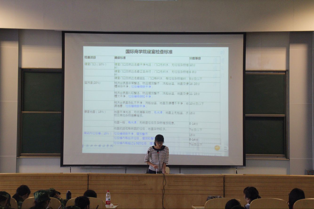 接下来公寓文化中心督察部部长童亚文对商学院寝室检查细则进行详细讲解。对检查重点以及扣分重点进行了解释,新生寝室长们也认真做好笔记。她传达了省里对寝室卫生检查的标准,提醒寝室长们要做好一天多次检查寝室的准备,时刻保持寝室卫生的整洁。