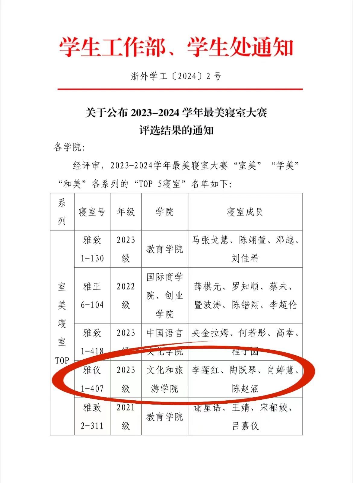 在2023—2024学年学校举办的“最美寝室大赛”中,泥巴影视 雅仪1-407(23旅管1班李莲红、陶跃琴、陈赵涵、肖婷慧)获评“室美”系列“TOP 5寝室”,让我们一起来康康获奖小窝吧!
