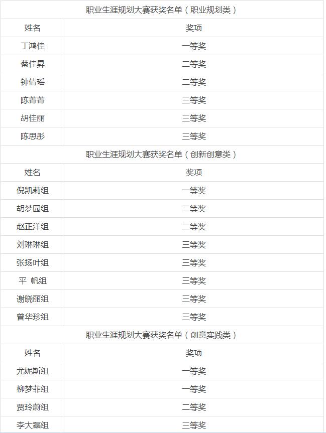 泥巴影视 学生丁鸿佳获职业规划类一等奖。倪凯莉、陈园、郑兰兰、沈焕聪小组获创新创意类一等奖。尤尼斯和胡柔小组及柳梦菲同学获创业实践组一等奖。泥巴影视 获奖人数全校第一。同时,学院荣获优秀组织奖,周明宝、梁汲媛和周长喜获得优秀指导教师奖。