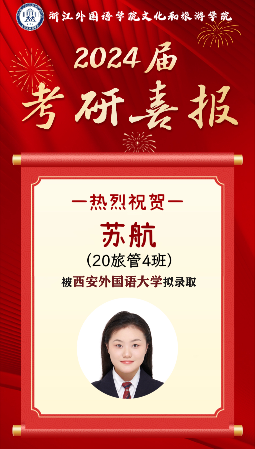 2024届文旅升学喜报⑦丨20旅管4班苏航拟录取西安外国语大学英语笔译专业硕士研究生