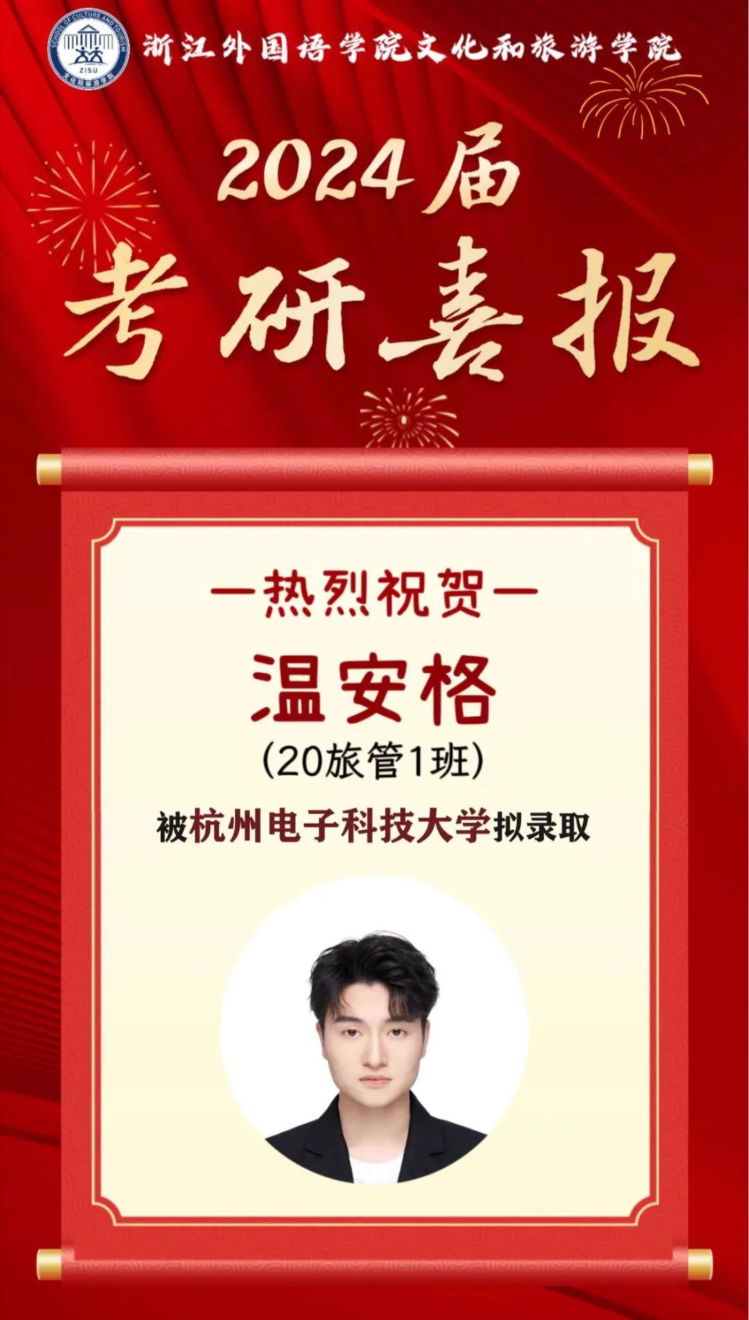 2024届文旅升学喜报⑨丨20旅管1班温安格成功考取杭州电子科技大学工业工程与管理专业硕士研究生