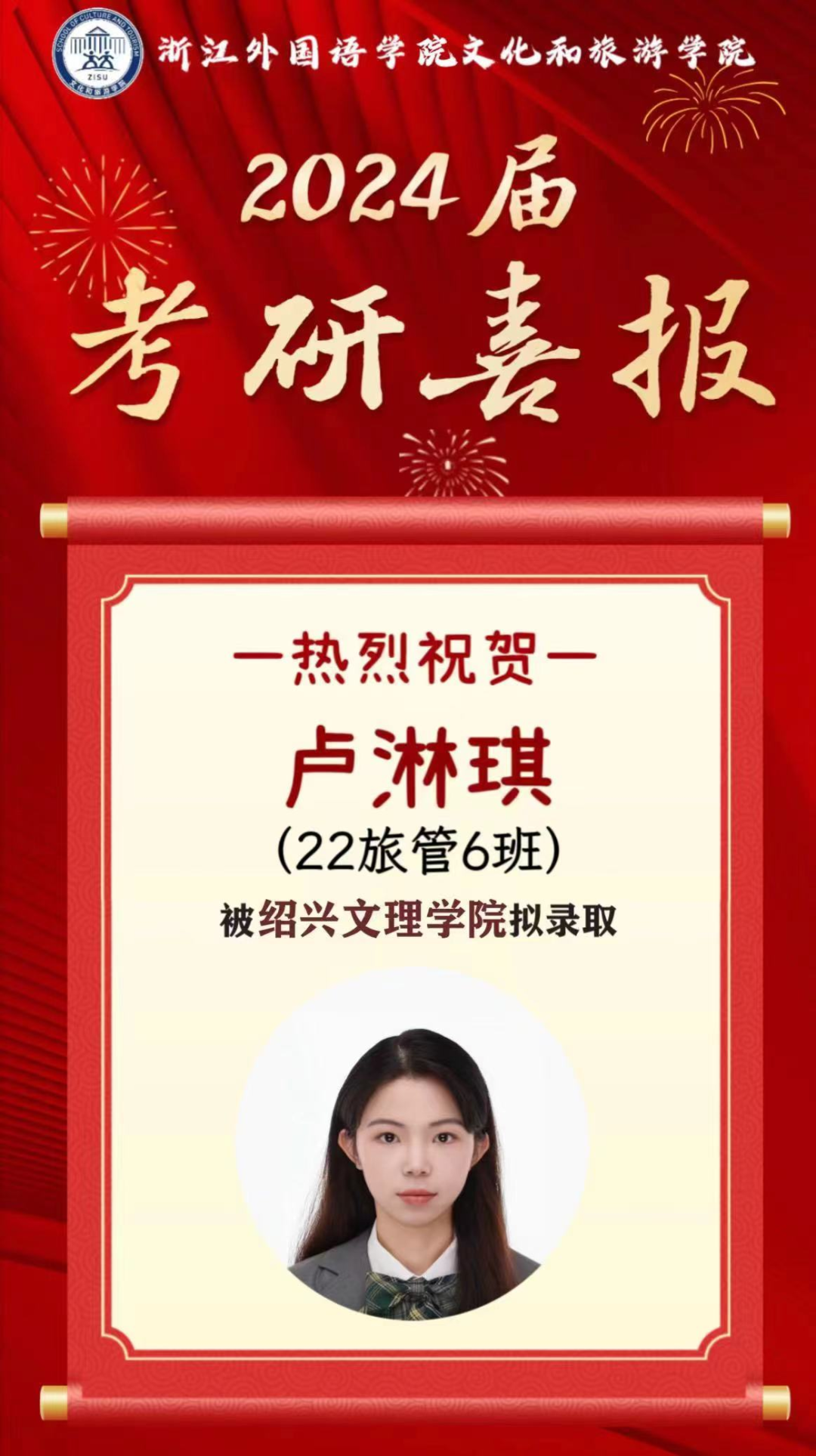 2024届文旅升学喜报⑫丨22旅管5班卢淋琪成功考取会计专业硕士研究生