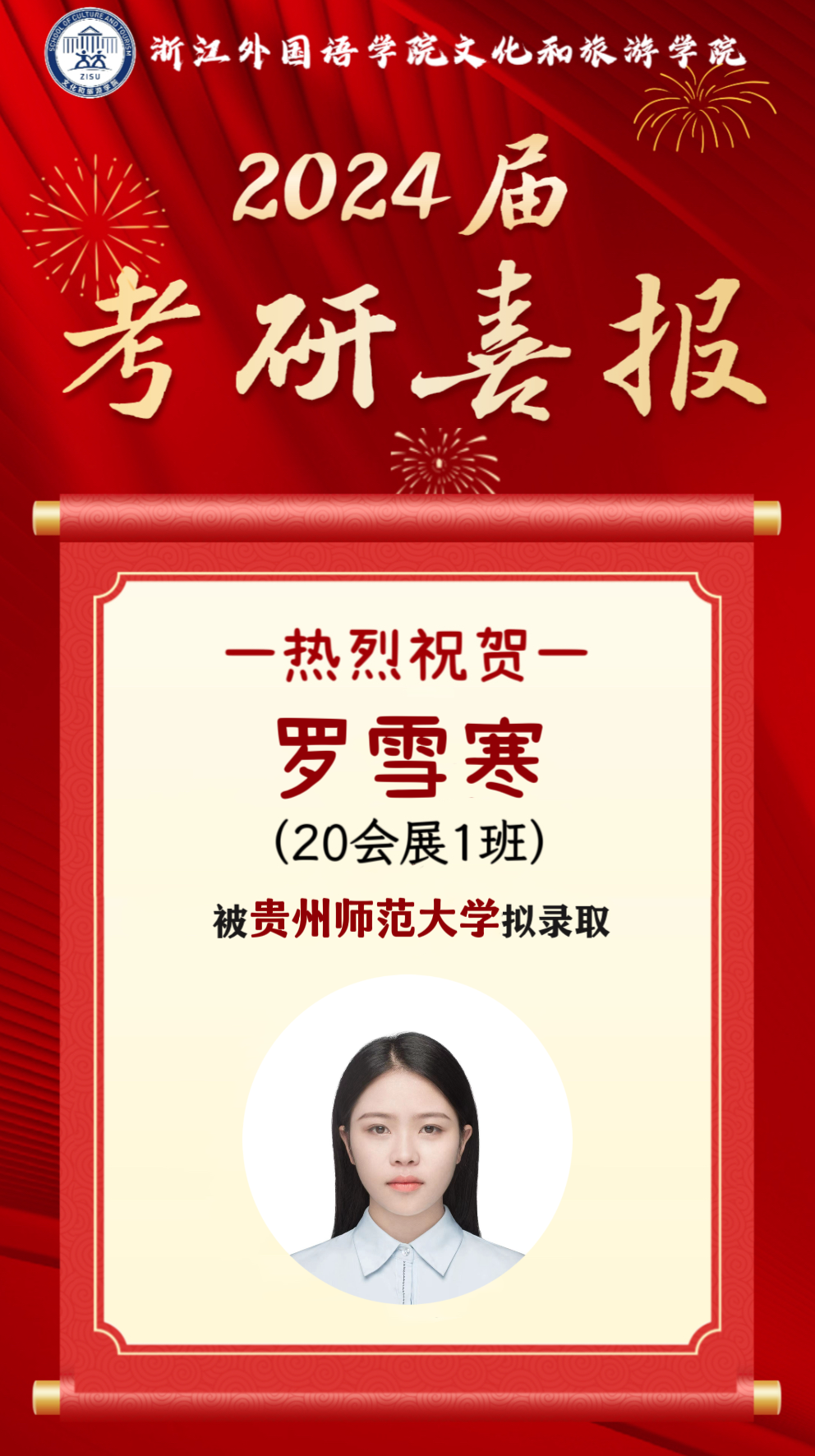 2024届文旅升学喜报⑬ | 20会展1班罗雪寒成功考取贵州师范大学社会工作专业硕士研究生
