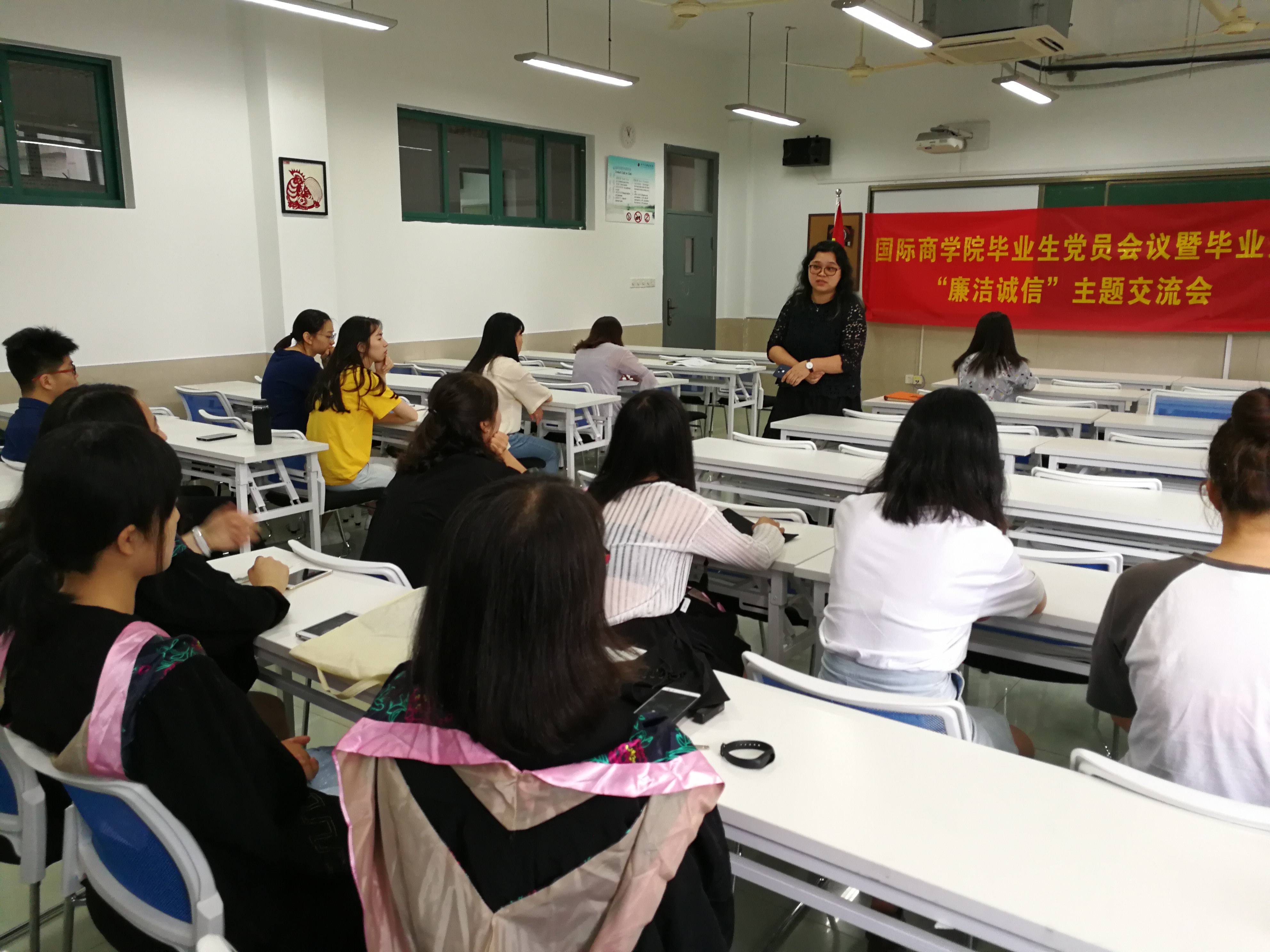 诚信是中华民族的传统美德。在毕业生踏入社会之际,“廉洁诚信”教育至关重要。旅游系教工党支部书记黄瑾用生动的事例与大家分享交流她作为一名共产党员工作后的成长经历并对即将毕业的学生寄语了深深的嘱托,她说,学生党员是一支有情怀、有思考的、有理想的党员队伍,要正确定位,珍惜自己的身份,在今后的职场工作中牢记责任,廉洁诚信,不忘学校的教导,做一个干干净净干事的人。