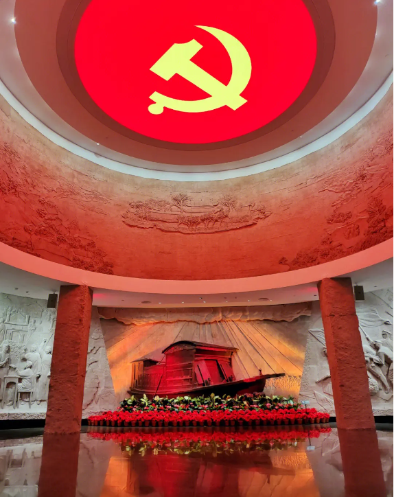 南湖革命纪念馆位于浙江嘉兴南湖边,于1959年10月1日建成。纪念馆按当年一大开会租用的游船式样,仿造了一条游船,作为一大纪念船,陈列在南湖的水面,形象地再现了中共一大会议在南湖举行、闭幕并宣告中国共产党的诞生的历史场景。中国共产党第一次全国代表大会最后一天(即7月30日)的会议,因遭法租界巡捕的袭扰搜查而被迫停会,会议代表秘密转移到浙江嘉兴南湖,于8月初的一天在南湖的游船上继续举行会议。在南湖游船上,代表们讨论通过了中国共产党的第一个纲领和第一个决议,选举产生了党的中央领导机构,宣告中国共产党成立。