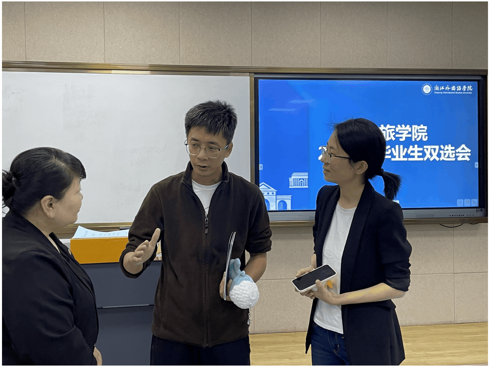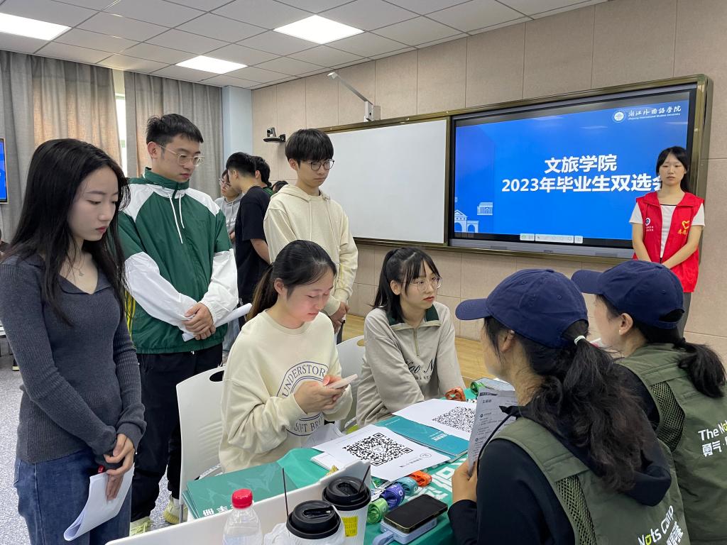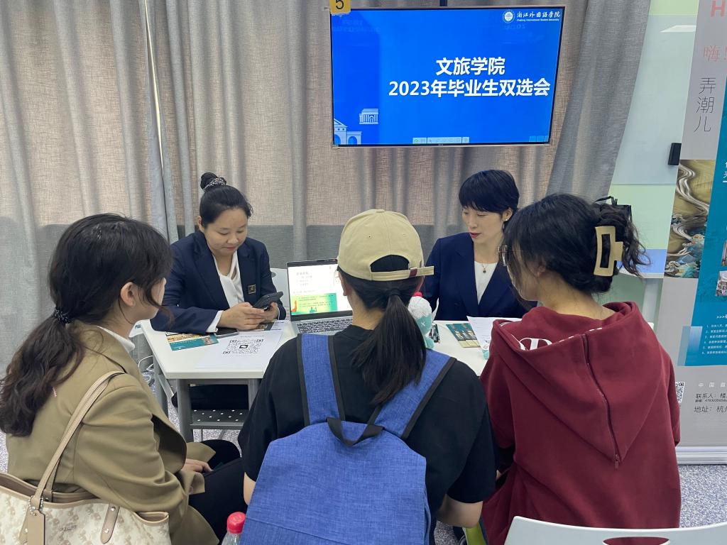 浙江皓石教育科技有限公司合伙人、产品经理胡总表示,学校为在校生提供了国际化的志愿服务平台和丰富的社会实践机会,学生综合素质高,公司对浙外的毕业生非常满意,所以只要浙外有招聘就会来。坚果部落是一家面向青少年及家庭的整合教育机构。人事部张经理充分赞扬了浙外学生的专业知识和精神面貌。她说:“现在文旅行业持续向好、发展蓬勃,公司需要一批热爱研学、专业过硬的学生。今天收到了很多简历,期待同学们的加入。”杭州JW万豪酒店人事部彭总说:“我们和泥巴影视