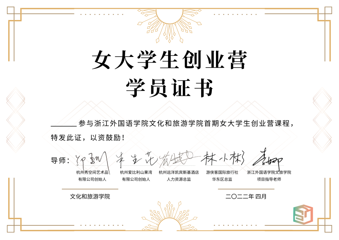党总支书记兼副院长范芸芸老师,副院长贾新明老师,党总支副书记陈超老师,数字文旅系系主任孙刘伟老师及数字文旅系教师李娜老师共同出席了本次结营仪式,创业营的四位企业导师杭州秀空间艺术品有限公司创始人郑秀珍女士,杭州爱比利山果湾有限公司创始人朱生花女士,杭州远洋凯宾斯基酒店人力资源总监黄盛霞女士以及游侠客国际旅行社华东区总监林小彬女士均应邀相聚云端。
