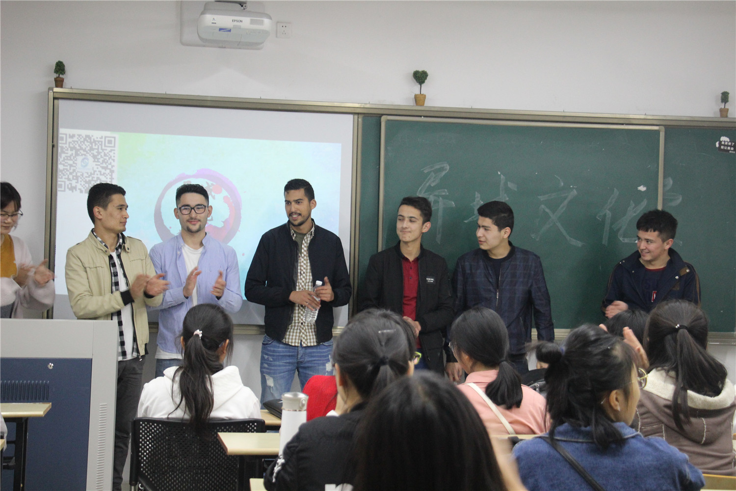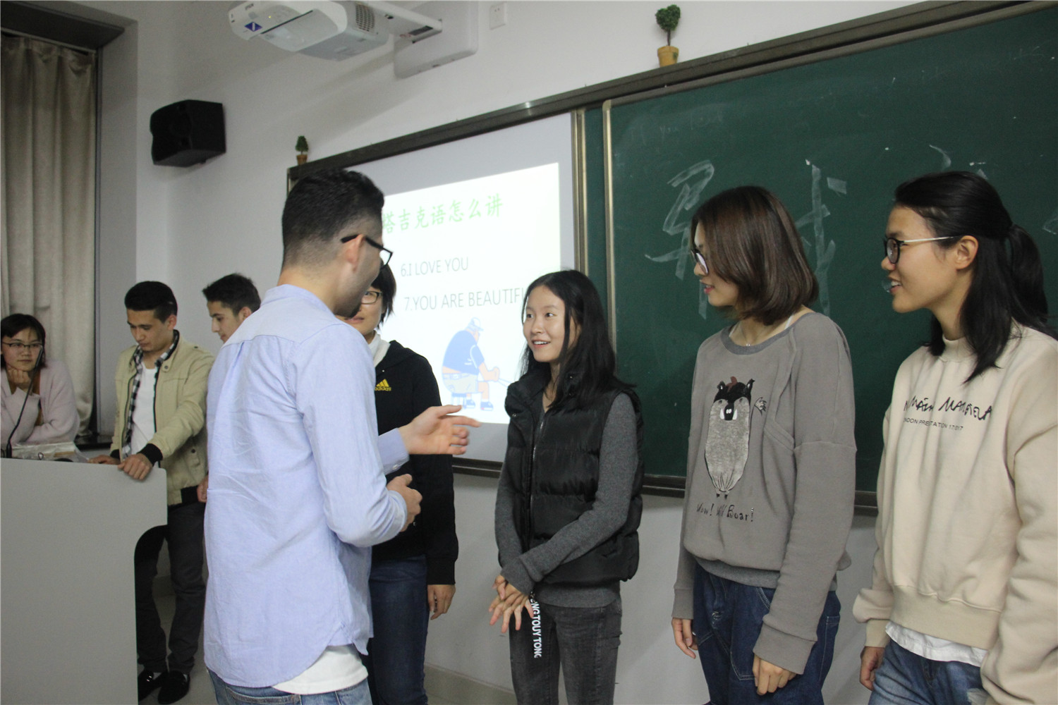 讲堂接近尾声,留学生小哥哥们展开了塔吉克语与社交礼仪的现场教学,邀请台下的同学们上台进行学习,同学们表现主动,展现了他们对新知识的渴求。