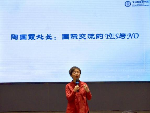 国际交流与合作处处长陶国霞老师落脚于本次大会四个关键词“共筑、共谋、共创、共享”中的“共筑”,指出国际交流共筑的是桥梁、是梦想。她从自身经历出发,结合文旅人实际,向同学们说明,通过国际交流能够不断加深对旅游资源、旅游产业的认识,并鼓励同学们积极参与,与世界对话。